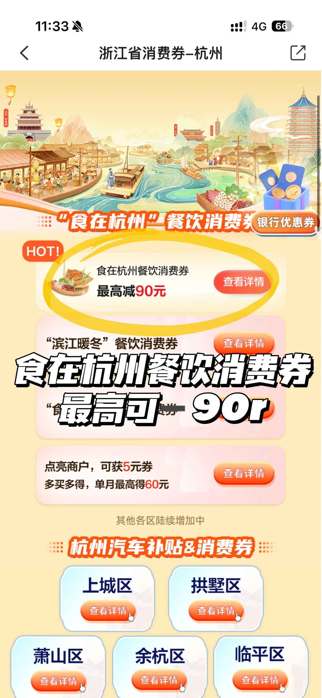 2️⃣进入【食在杭州餐饮消费券最高减90元】活动页面,即可领取不同力度的杭州餐饮消费券🧧