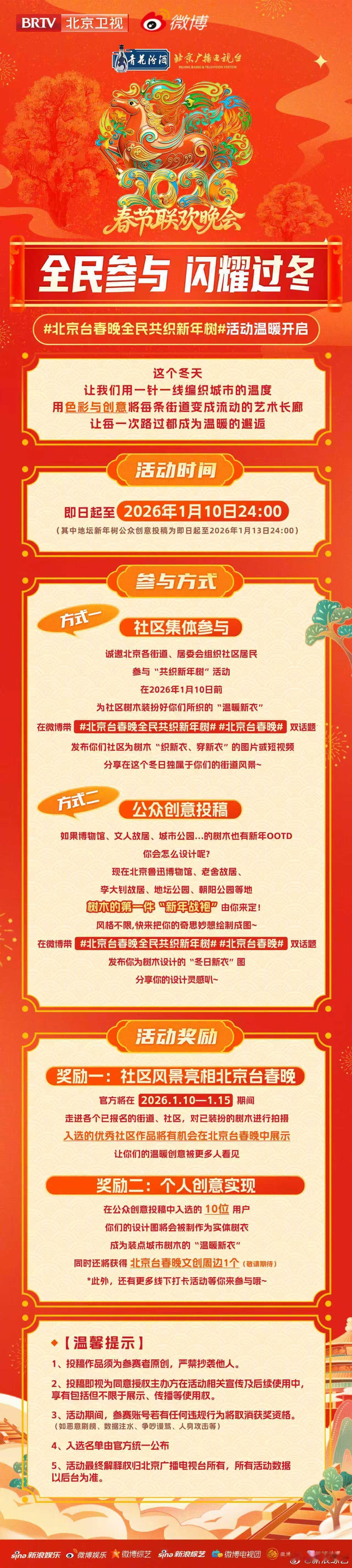 北京台春晚全民共织新年树2026年北京台春晚官宣 当古树遇见新衣,让历史遇见温暖!全城文化地标树木等您来设计“新年皮肤”带上你的奇思妙想,即日起参与活动,用编织点亮城市记忆,用色彩温暖历史街角。您的设计或许就是下一个网红打卡点!北京台春晚