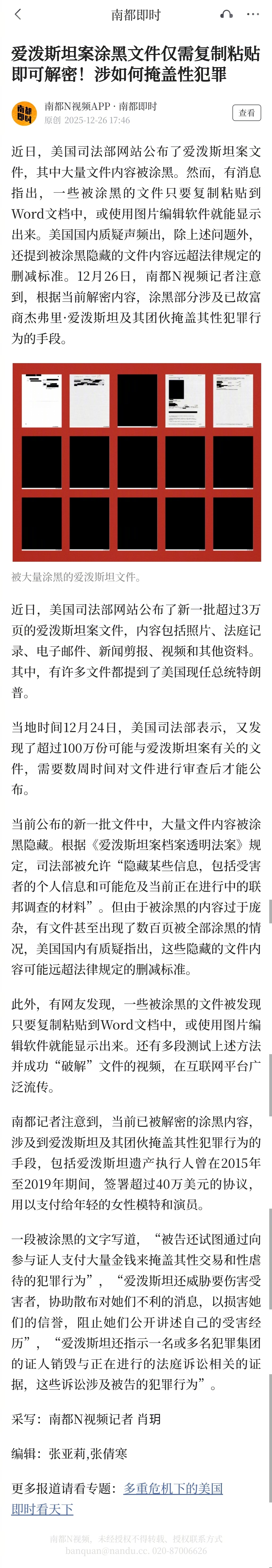 #爱泼斯坦案涂黑文件如何解密#【爱泼斯坦案涂黑文件仅需复制粘贴即可解密!涉如何掩盖性犯罪】#爱泼斯坦案涂黑文件涉掩盖性犯罪#近日,美国司法部网站公布了爱泼斯坦案文件,其中大量文件内容被涂黑。然而,有消息指出,一些被涂黑的文件只要复制粘贴到Word文档中,或使用图片编辑软件就能显示出来。美国国内质疑声频出,除上述问题外,还提到被涂黑隐藏的文件内容远超法律规定的删减标准。12月26日,南都N视频记者注意到,根据当前解密内容,涂黑部分涉及已故富商杰弗里·爱泼斯坦及其团伙掩盖其性犯罪行为的手段。近日,美国司法部网站公布了新一批超过3万页的爱泼斯坦案文件,内容包括照片、法庭记录、电子邮件、新闻剪报、视频和其他资料。其中,有许多文件都提到了美国现任总统特朗普。当地时间12月24日,美国司法部表示,又发现了超过100万份可能与爱泼斯坦案有关的文件,需要数周时间对文件进行审查后才能公布。当前公布的新一批文件中,大量文件内容被涂黑隐藏。根据《爱泼斯坦案档案透明法案》规定,司法部被允许“隐藏某些信息,包括受害者的个人信息和可能危及当前正在进行中的联邦调查的材料”。但由于被涂黑的内容过于庞杂,有文件甚至出现了数百页被全部涂黑的情况,美国国内有质疑指出,这些隐藏的文件内容可能远超法律规定的删减标准。有网友发现,一些被涂黑的文件被发现只要复制粘贴到Word文档中,或使用图片编辑软件就能显示出来。还有多段测试上述方法并成功“破解”文件的视频,在互联网平台广泛流传。南都记者注意到,当前已被解密的涂黑内容,涉及到爱泼斯坦及其团伙掩盖其性犯罪行为的手段,包括爱泼斯坦遗产执行人曾在2015年至2019年期间,签署超过40万美元的协议,用以支付给年轻的女性模特和演员。