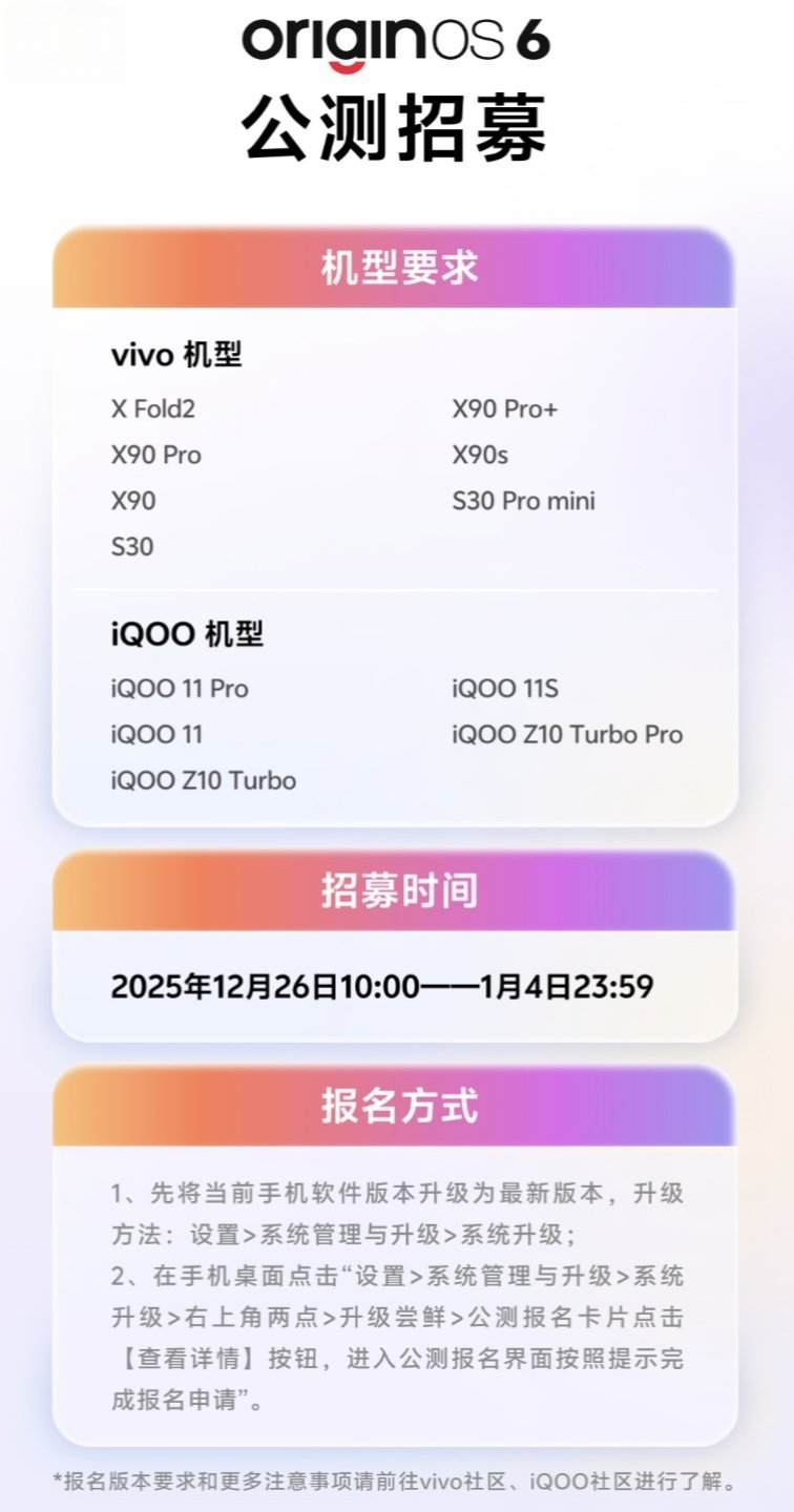【vivo OriginOS 6 开启新一期公测招募报名,覆盖 X Fold2、X90 系列及 iQOO 11 等机型】vivo 在微博宣布,OriginOS 6 系统现已开启新一轮公测招募报名,涵盖 vivo 和 iQOO 品牌共计 12 款机型。附本次招募详情、报名教程如下:一、招募时间:2025 年 12 月 26 日(今天)10:00—2026 年 1 月 4 日 23:59二、机型要求:vivo 品牌:X Fold2X90 Pro+X90 ProX90sX90S30 Pro miniS30iQOO 品牌:iQOO 11 ProiQOO 11SiQOO 11iQOO Z10 Turbo ProiQOO Z10 Turbo三、报名教程:先将当前手机软件版本升级为最近版本(方法:设置--> 系统管理与升级--> 系统升级)在手机桌面点击“设置--> 系统管理与升级--> 系统升级--> 右上角两点--> 升级尝鲜--> 公测报名卡片点击【查看详情】按钮,进入公测报名界面按照指示完成申请”。