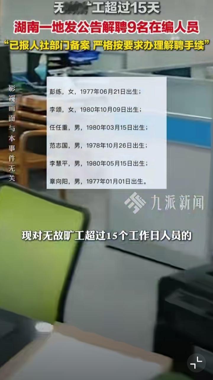 湖南汨罗市弼时镇人民政府,于2025年12月24日发布公告称,9名在编人员,因违反《事业单位人事管理条例》,“长期在编不在岗,连续旷工15日可辞退”条款,决定予以解聘。 被解聘的9名在编人员年龄都在45-48岁之间,这个年龄段的人应该处于事业稳定期,也正是上有老下有小,家庭负担最重的阶段。别人挤破脑袋追求的编制,他们却在自己的岗位消极摆烂,长期旷工,这般操作实在让人费解。 难道他们不知道连续旷工的后果吗?我想答案大概率应该是否定的。从他们的年龄看早已超过了考公考编以及遴选的年龄限制,跳槽难度不小。有人推测他们可能在外当大老板,有更好的出路,也有人推测他们嫌工资过低,不能养家糊口,压力大,才抱着无所谓的摆烂心态。 此次一次性解聘9名,背后可能有更深层次的原因,但网友的评价十分中肯:既点赞了政府“敢于触碰沉疴”的魄力,也直言“铁饭碗的核心是铁纪律”——严惩吃空饷,既是对公职人员的警醒,更能保障财政资源的公平分配。 无论出于何种理由,公职人员都不应该突破原则底线。在岗一天就得履职一天,领一日俸禄就得守一日规矩,不能占着毛坑不拉屎;即使对工作不满意,完全可以主动辞职 ,光明磊落而来,清清白白而去。反观被公开解聘,那性质截然不同,不仅颜面无光,更会给个人职业生涯留下难以抹去的污点,得不偿失。