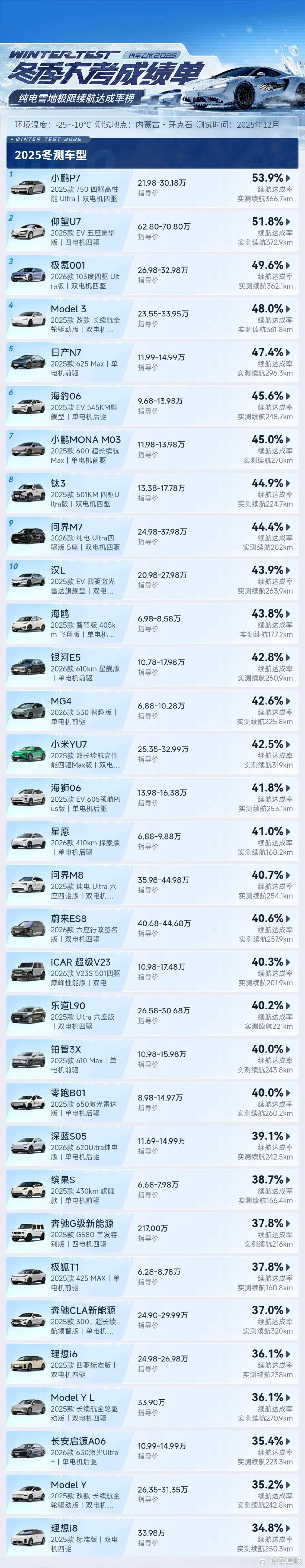 汽车之家公布冬测成绩,纯电雪地极限续航达成率榜单出炉,小鹏P7排名第一,特斯拉Model Y和理想i8垫底了!