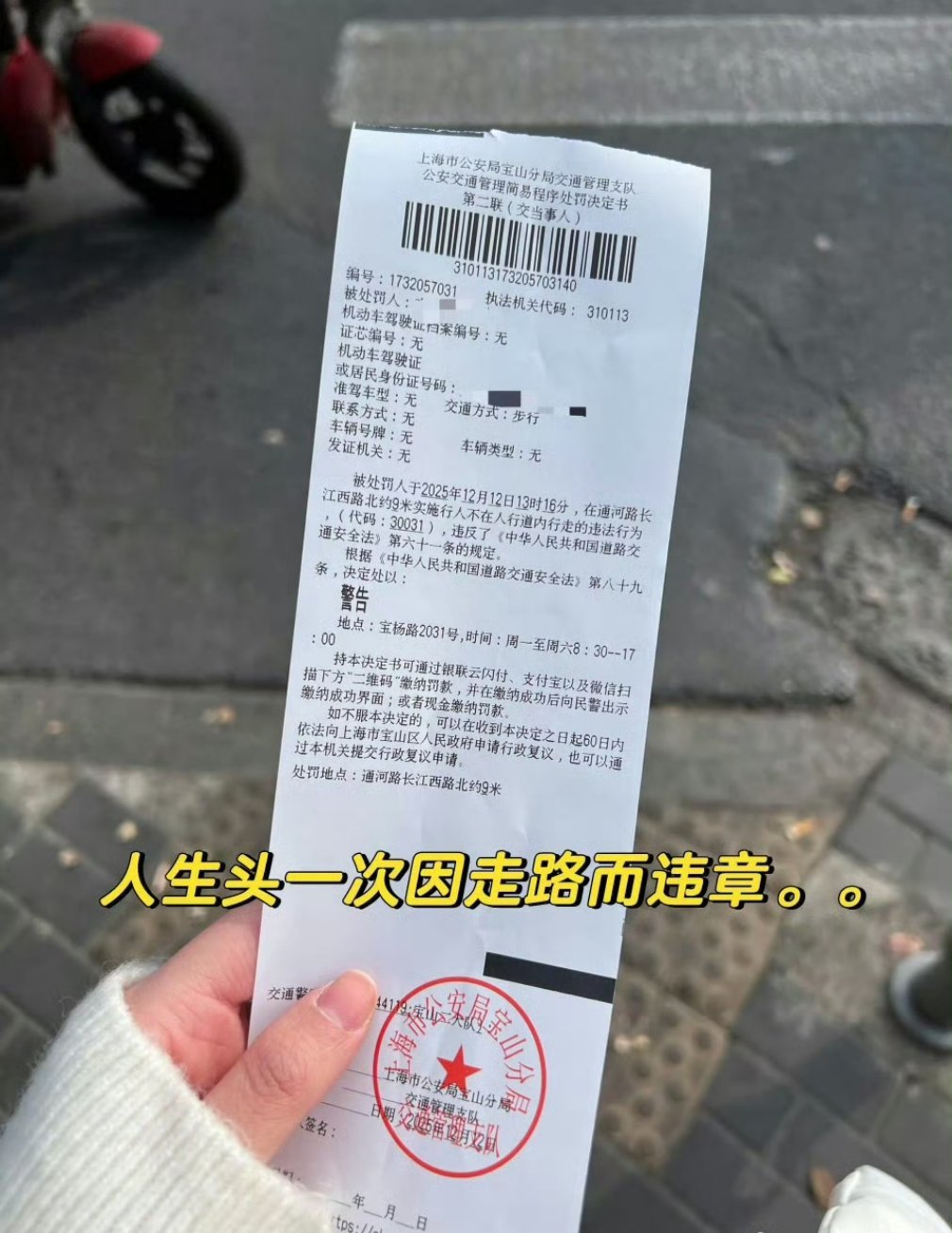 上海走路违章不在人行道上走违章,这个处罚还好吧?况且还是警告没罚钱。我骑自行车闯了红灯,被罚50