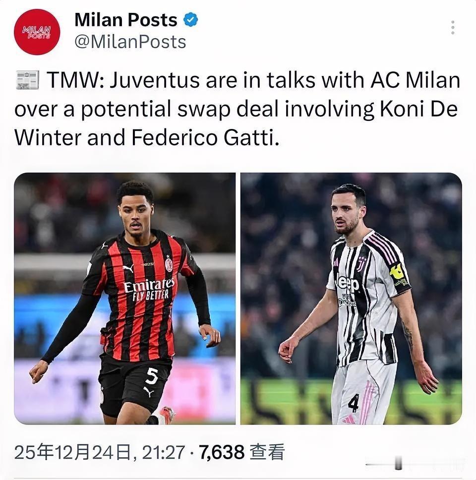 费德里科·加蒂!米兰一直都与费德里科·加蒂有联系,他是阿莱格里欣赏的球员,米兰也确实向尤文图斯报价了,但米兰送出的报价为租借加选择性买断,而不是球员交换,球员交换是尤文图斯提出的,尤文图斯希望米兰可以把球员加入到交易之中,所以才有了米兰要用谁谁谁换费德里科·加蒂,实际上这只是尤文图斯的一个提议,这个提议并没有被认可。 尤文图斯不再认为加蒂是非卖品,而费德里科·加蒂又深受阿莱格里喜爱,所以这笔交易有可能会发生,但在冬季窗口米兰不付出代价是很难得到费德里科·加蒂的。自从布雷默受伤后,费德里科·加蒂表现越来越差劲,尤文图斯貌似是想明白了,没有布雷默费德里科·加蒂到底是啥水平,但费德里科·加蒂依然是一线的球员,所以指望尤文图斯答应租借这个可能性太小了,当然也不能说毫无可能性,毕竟之前米兰就是把卡卢卢这样送到尤文图斯的。 值得注意的是,米兰并不只是关注了费德里科·加蒂一名后卫球员,他们也在评估其他中后卫,因此如果沒有办法达成协议,米兰对加蒂的兴趣最终可能会被放弃。