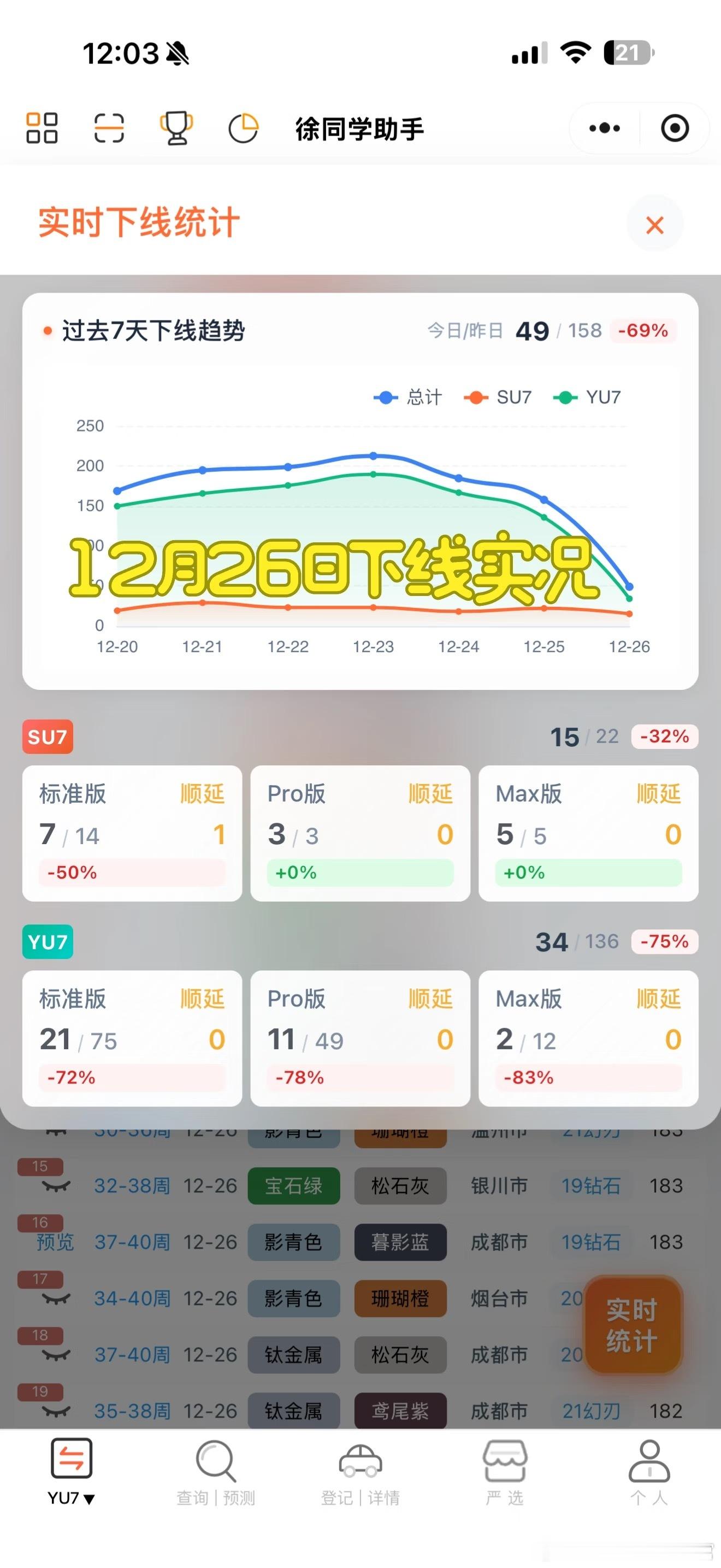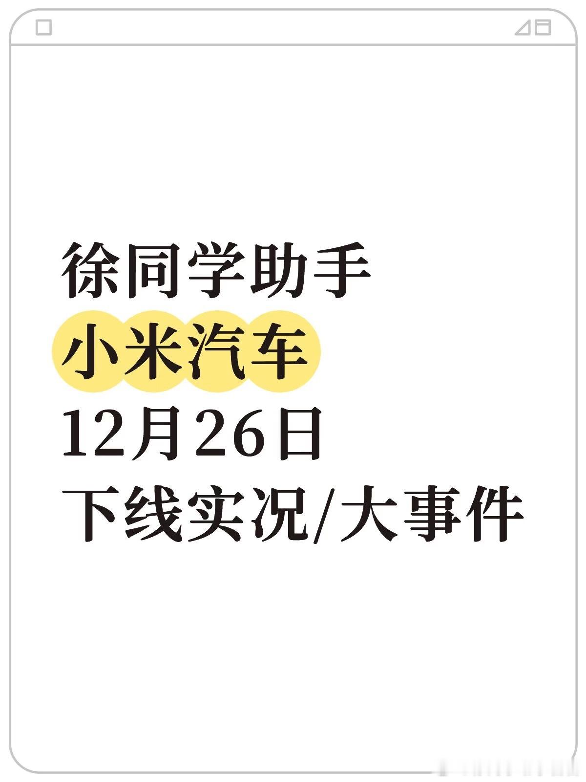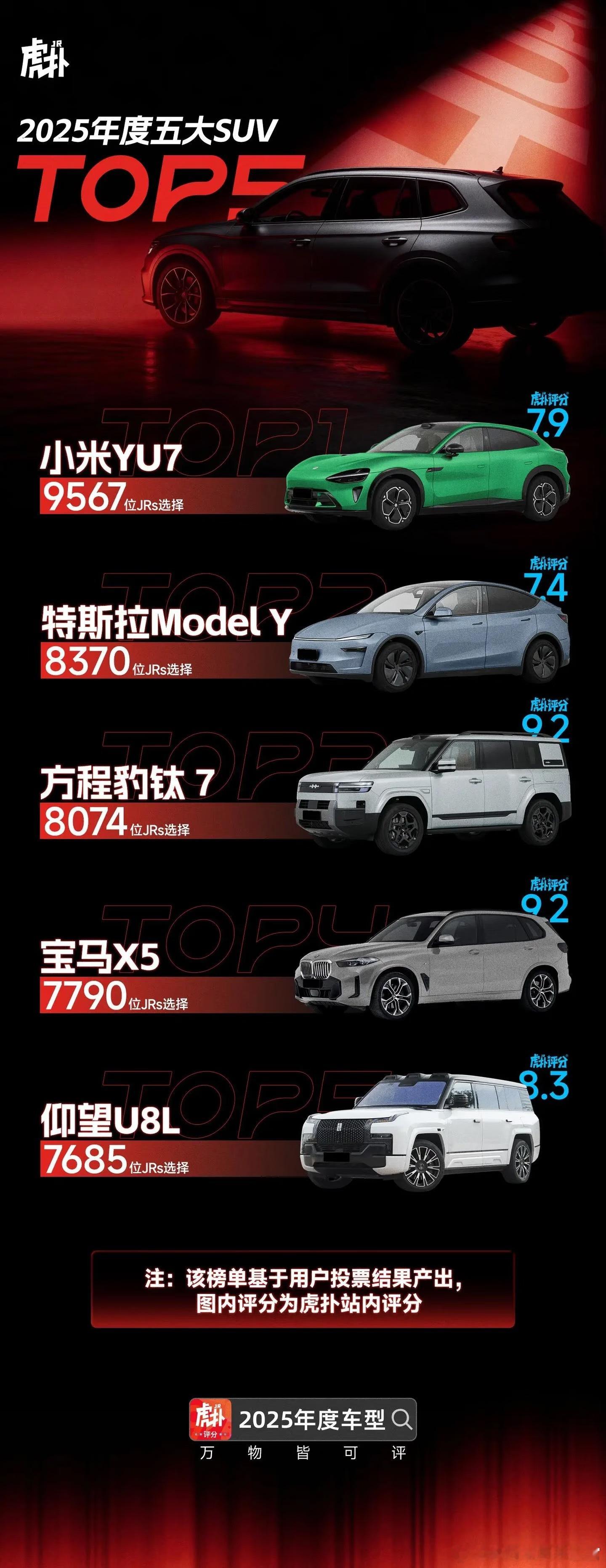 ‼️虎扑2025年度车型榜单评选结果出炉:【小米YU7被评为年度神车】(图二)1️⃣其中年度轿车榜单中:su7ultra排第二名,第一名是很冷能的仰望U72️⃣年度SUV榜单中:小米YU7当选榜首,model y排第二(该榜单仅代表了虎扑JRS)今晚24点【现车选购】即结束,想尽快提车的得抓紧决定了,还有机会兜底购置税。📈下线进度小米YU7:下线登记合计136台,不少7月份锁单50多周的标准版下线了,但是也有0-3还没消息的小米SU7:下线登记合计23台,一些8月份的标准版还在正常下线,新款可能要多等一下了昨晚发布会看到雷总的状态是非常疲惫,最近新车估计是没啥消息了。更多小米汽车相关的详细日报请参考【米车派】,偶尔有爆料哦,还有其他惊喜~徐同学助手小米汽车汽场全开