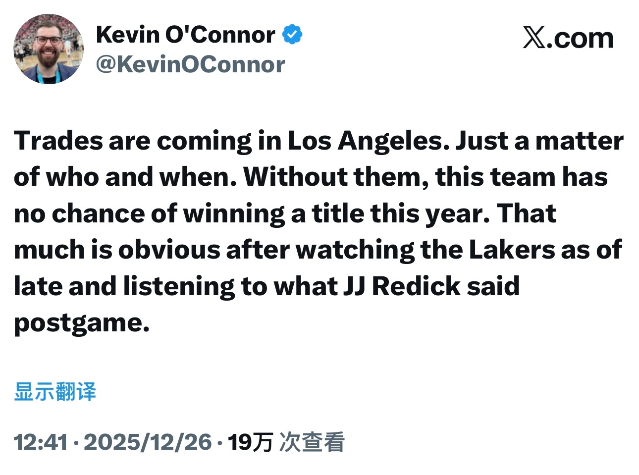 资深记者Kevin O'Connor:湖人交易很快就会到来,只是交易对象和时间的问题。如果不做交易,这队今年根本没机会夺冠。看完湖人近期的比赛,再结合雷迪克赛后的发言,这一点再明显不过了。
