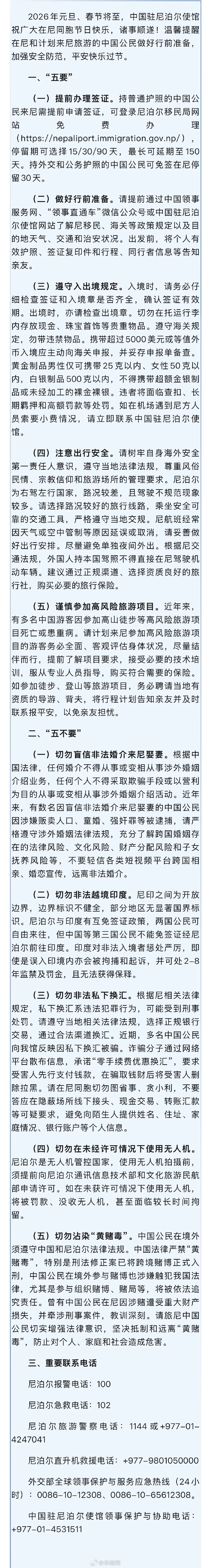 【中使馆紧急提醒:#切勿盲信非法婚介来尼娶妻#】#我使馆提醒切勿盲信到尼泊尔娶妻#中国驻尼泊尔使馆26日发文提醒中国公民元旦、春节期间来尼旅游“五要五不要”:切勿盲信非法婚介来尼娶妻。根据中国法律,任何婚介不得从事或变相从事涉外婚姻介绍业务,任何个人不得采取欺骗手段或以营利为目的从事或变相从事涉外婚姻介绍活动。近年来,有数名因盲信非法婚介来尼娶妻的中国公民因涉嫌贩卖人口、童婚、强奸罪等被逮捕,请严格遵守涉外婚姻法律法规,充分了解跨国婚姻存在的法律风险、文化风险、财产分配风险和子女抚养风险等,不要轻信各类短视频平台跨国相亲、婚恋宣传,远离非法婚介。