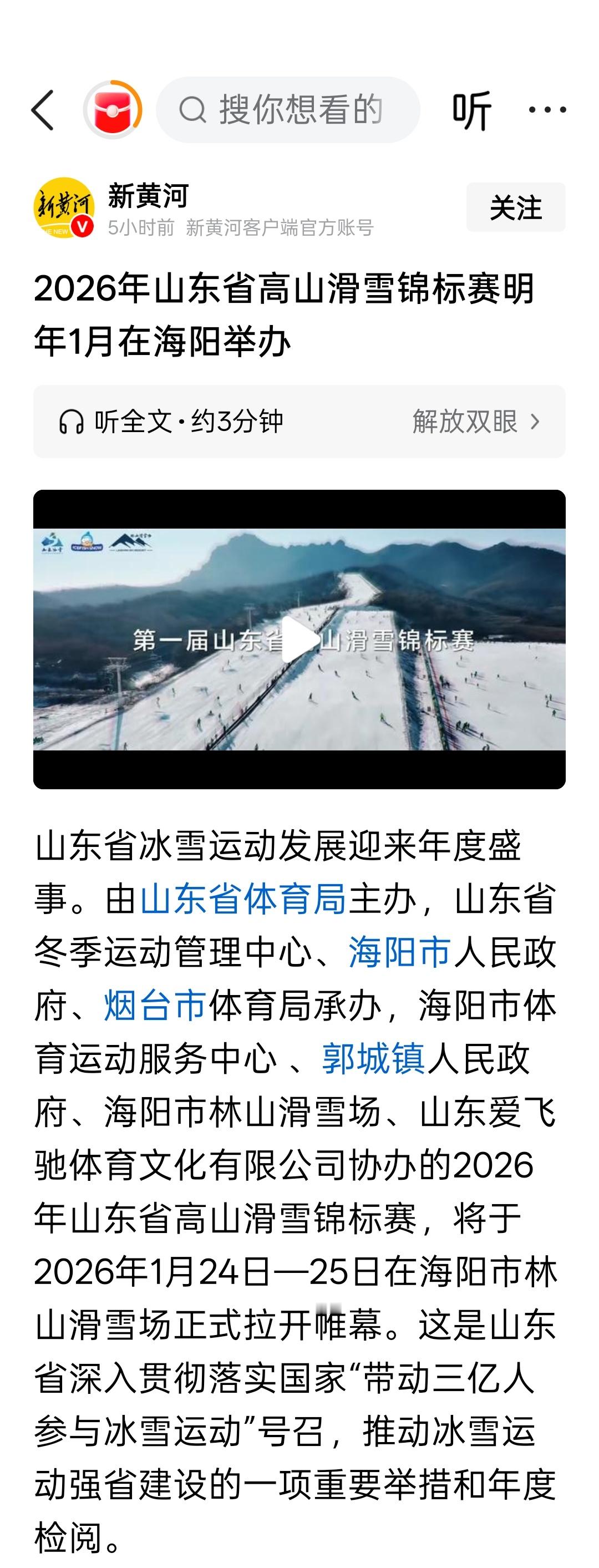 2026年山东省高山滑雪锦标赛明年1月24-25日在海阳林山滑雪场举办