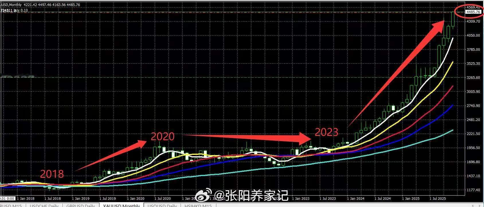 黄金突破4500,再掀抢金热潮 自2023年10月起,黄金如开闸之洪水,来势汹汹、浩浩荡荡,将全世界卷入抢金大潮。 近年来,黄金价格屡创新高,涨势愈发强劲,势头丝毫不减。近期,国际金价突破4400,直逼4500,国内黄金报价也突破1000整数大关,从2019年的三百多元,直接翻了三倍。可以说,黄金是最具投资价值的标的,没有之一。 正因如此,抢金热潮一波接着一波。上至各国纷纷增加黄金储备,下至有投资意识的家庭和个人也在增持黄金。这波储备操作让参与者赚得盆满钵满,当局者喜上眉梢,旁观者羡慕不已。正所谓,机会来临时一旦抓住想不挣钱都难。 那么现在的黄金到底是机遇还是风险,我个人认为(只是个人观点不做投资建议)目前没有入市的朋友也不要临渊羡鱼了。凡事人人都知道有利时便要懂得退步,反而人人都不看好时可以考虑一下。尽管有机构预测黄金会涨到5000,可是目前距离5000点就剩500点左右的上涨空间了,而连续上涨数年,未曾出现过大跌回调,相比下跌空间而言上空间明显小于下跌空间。反而这个时候是减持,获利止盈的最佳时期(卖在人声鼎沸时,买在无人问津处),虽然你可能不是在最高点卖掉的,但是也不会在高点出现大跌开始时考虑卖出要明智许多。 也许你有更好的想法我们可以在评论区交流互相学习。