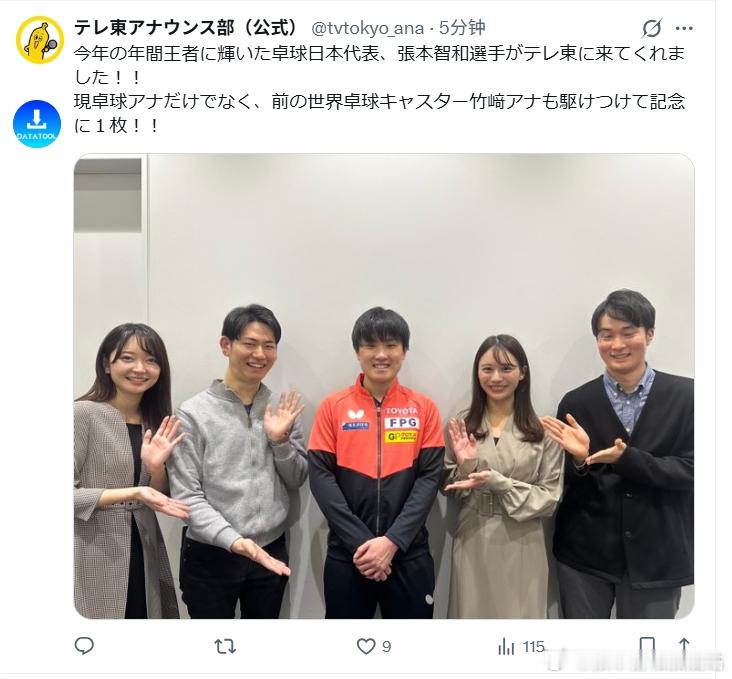 张本智和 去了东京电视台。“荣获本年度年度王者的日本乒乓球队代表选手张本智和,来到了东京电视台!!不仅有现役乒乓球解说员,前世界乒乓球赛事解说员竹崎解说员也专程赶来,一同合影留念!”(机翻)cr: 东京电视台播音部官方账号。