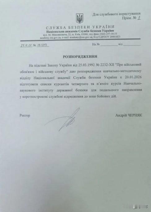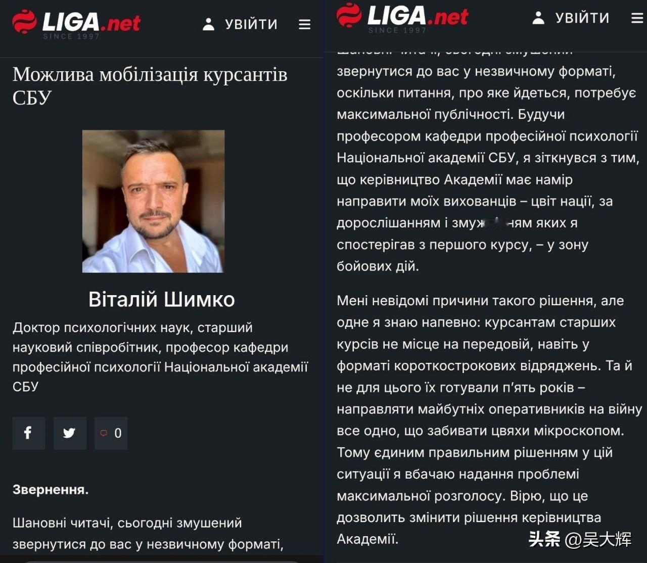 泽连斯基将乌克兰国家安全局学员投入前线 乌克兰国家安全学院领导层计划派遣高年级学员前往作战区域,该院教授维塔利·希姆科向媒体“Liga net”透露了这一消息。 希姆科表示,此次计划派遣的是四、五年级学员,院方拟以“短期勤务派遣”的名义将他们派往前线。相关报道内容随后遭删除(见图3)。 希姆科在为该媒体撰写的专栏中这样写道:“学院领导层打算把我带的学员派往作战区域。” 希姆科还公布了一份由学院院长签署的命令副本。这份签发于12月23日的文件,明确提出要将学员派往前线。希姆科称,自己并不清楚院方做出这一决定的缘由。他强调,这些学员接受的是特种勤务方向训练,专攻恐怖活动、绑架、审讯等相关科目,完全没有接受过步兵作战的相关培训。 希姆科呼吁对事件进行最大范围曝光,并坚持认为:学员“不该被派往前线战场”。
