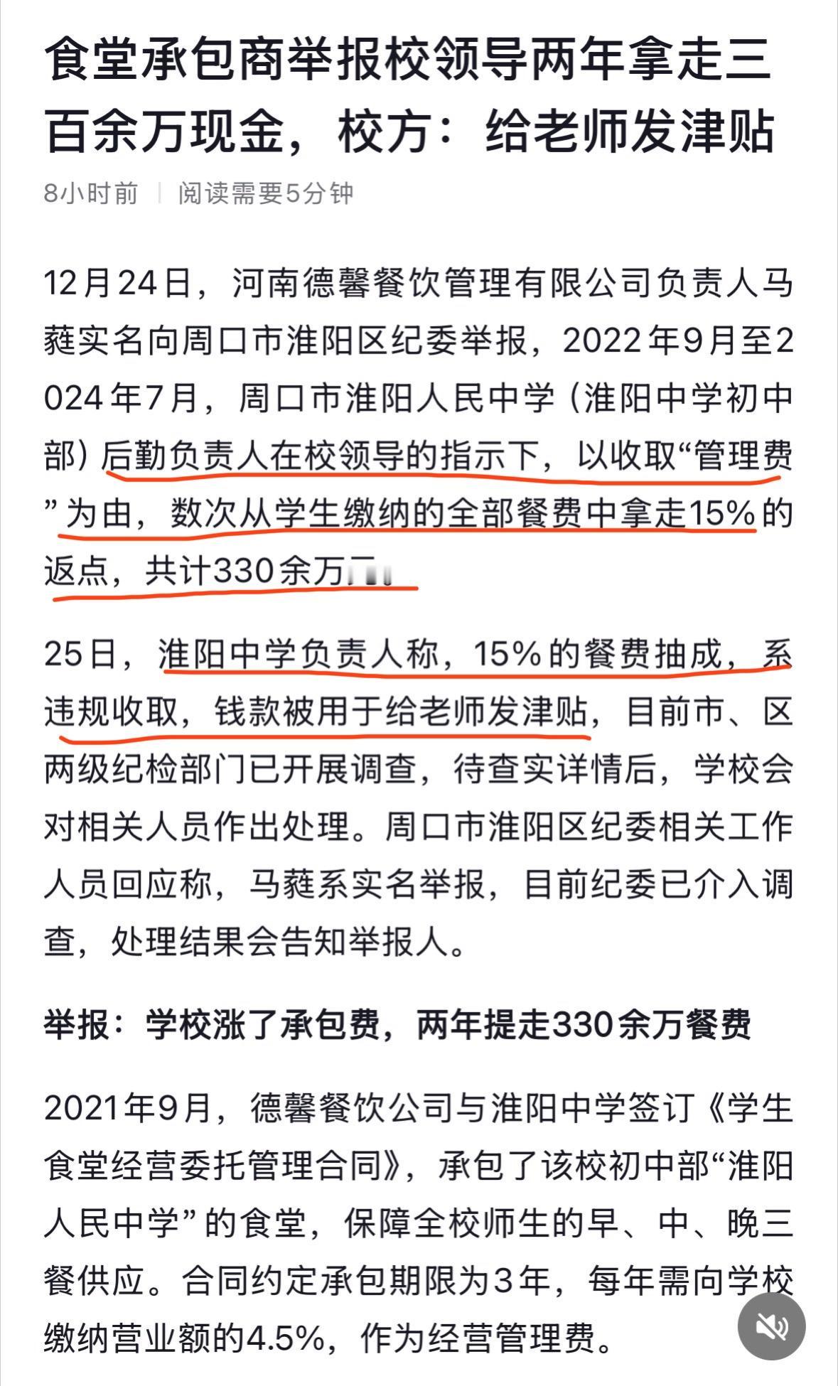 一切为了孩子成空口号,学校领导两年时间从食堂提走330万,称给老师发津贴。 学校领导指示后勤人员以管理费为由抽学生缴纳餐饮费的15%,举报人称如果不缴纳15%的管理费就让走人。 转了一圈家长交的饭钱,自己的孩子没有吃够,学校抽了15%,餐饮商家为了利润,可能会降低饭菜标准,恶性循环。