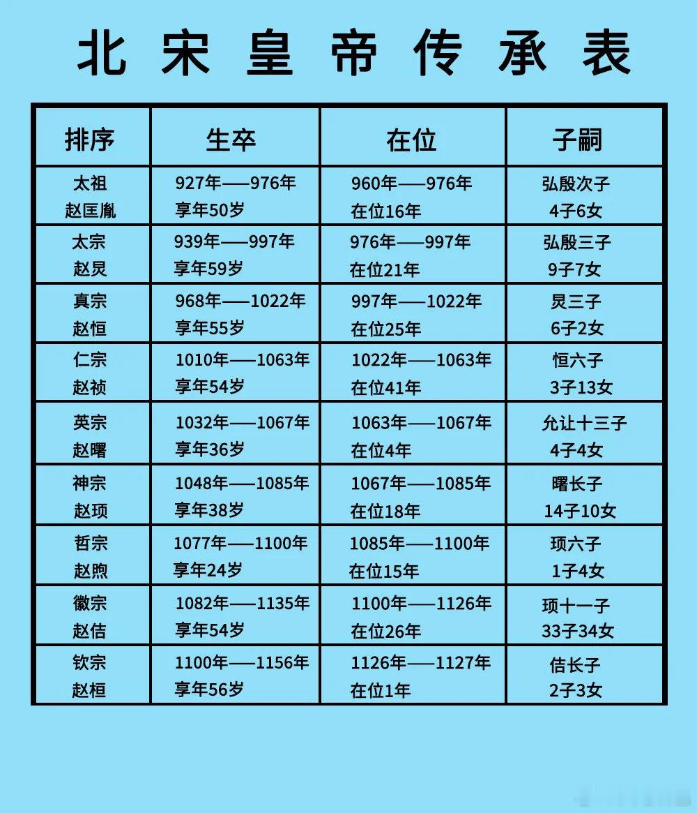 北宋九位皇帝宋太祖·赵匡胤,在位16年,50岁,建立北宋。宋太宗·赵光义,在位21年,59岁,灭亡北汉。宋真宗·赵恒,在位25年,55岁,前期勤政,后期昏庸。宋仁宗·赵祯,在位41年,一代明君。宋英宗·赵曙,在位4年,支持司马光编纂《资治通鉴》。宋神宗·赵顼,在位18年,任用王安石变法。宋哲宗·赵煦,在位15年,推行变法政策。宋徽宗·赵佶,在位26年,昏庸无能,导致靖康之耻。宋钦宗·赵桓,在位1年,背锅侠,接替徽宗皇位。