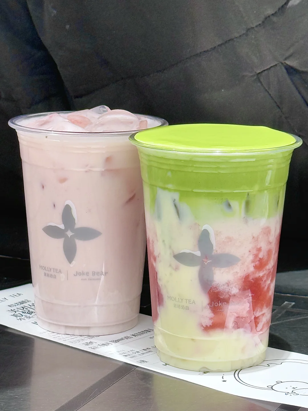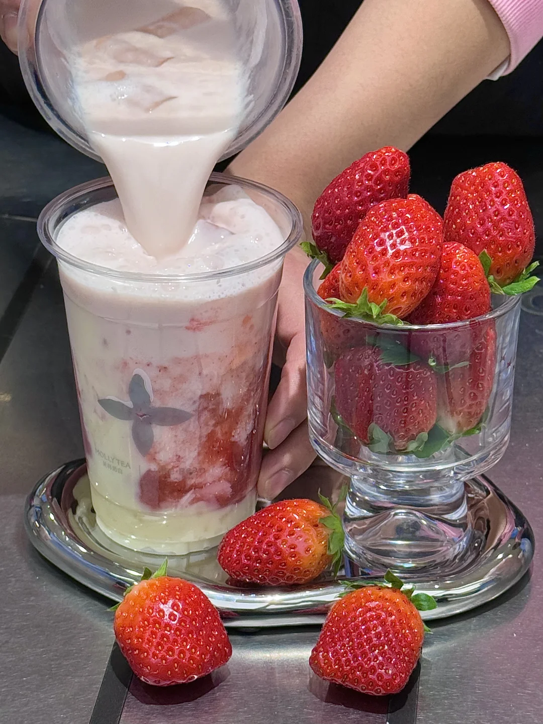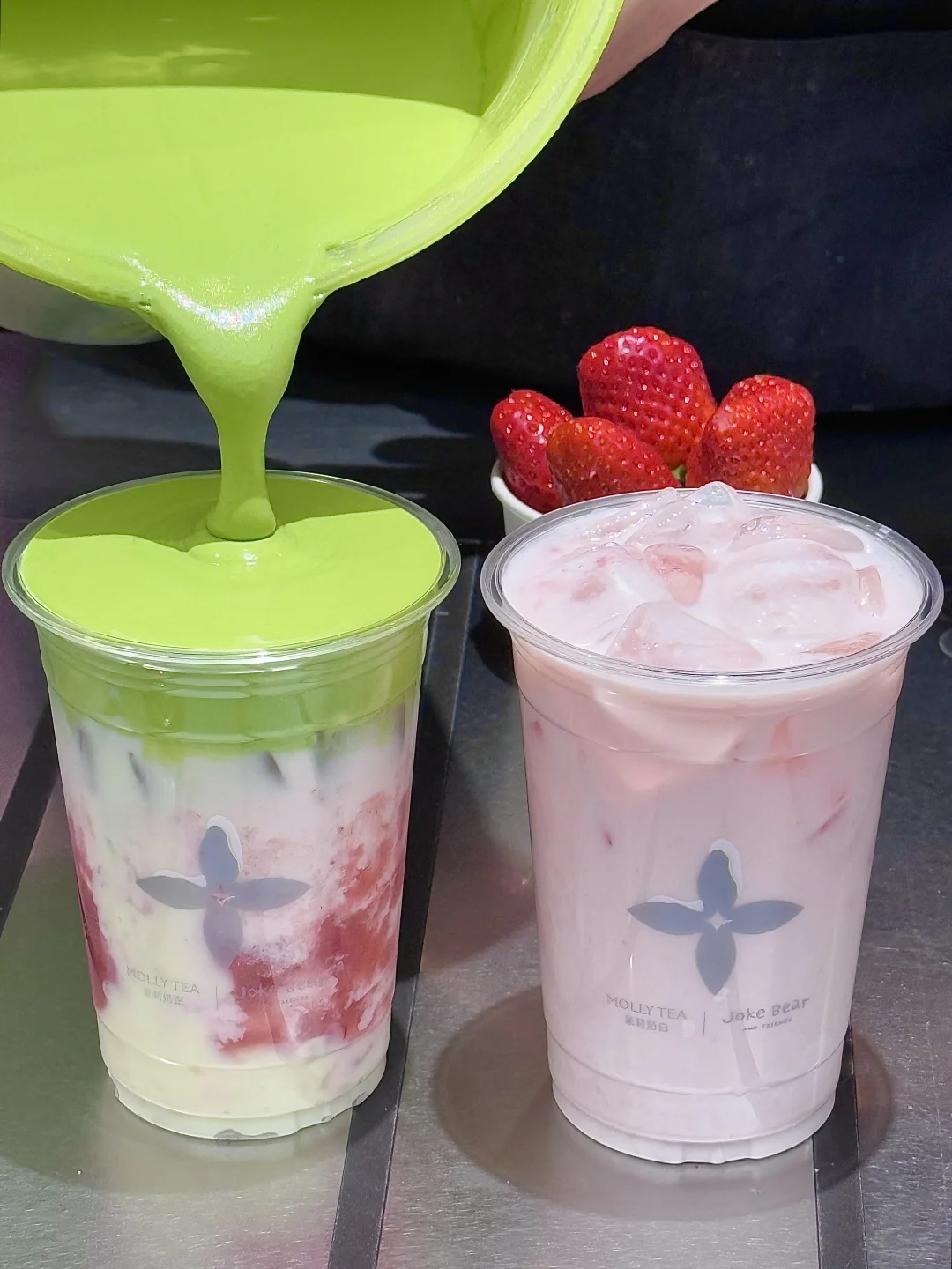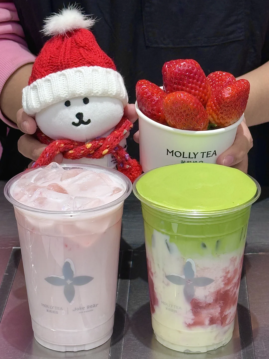 啊啊啊啊草莓控和大福控给我去喝!!好喝疯了!! 针王草莓大福草莓味好浓郁,好丝滑,小料好多的液体🍓cupcake!!喝起来也太有层次了!! 入口就是草莓果肉+草莓牛乳+草莓奶冻的三倍暴击!还有拉丝米麻薯的绵糯口感!一口就幸福到飞起了!! 还有针王草莓,草莓牛乳里加了红苹果汁,双倍果香混合奶香,大吸一口底部的复合咸乳酪直接惊艳了 冷热都好喝!!真草莓奶茶届的仙品!! 分享我的diy:加抹茶奶盖!更有层次更好喝!