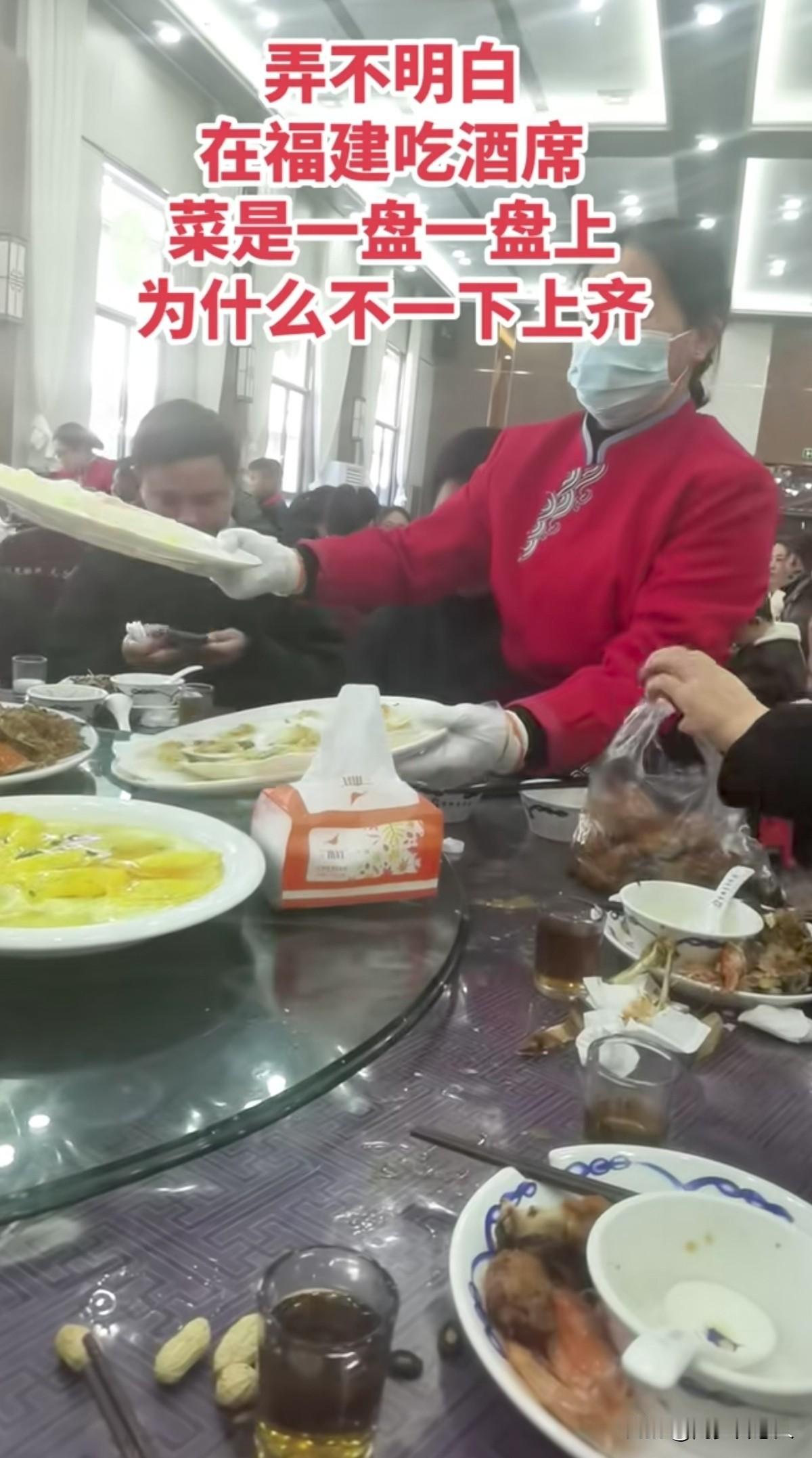 涨知识了,原来福建人摆酒席,担心害怕有人抢菜,菜都是一盘一盘上的,难怪在网上很少看到有福建酒席抢菜的视频! 个人觉得,这个做法挺好的,在不能保证参加酒席所有人的素养前提下,以防小人的方法,将每道菜,间隔一段时间再上下一道菜。 如此下来,就不会出现抢菜的不文明场面。