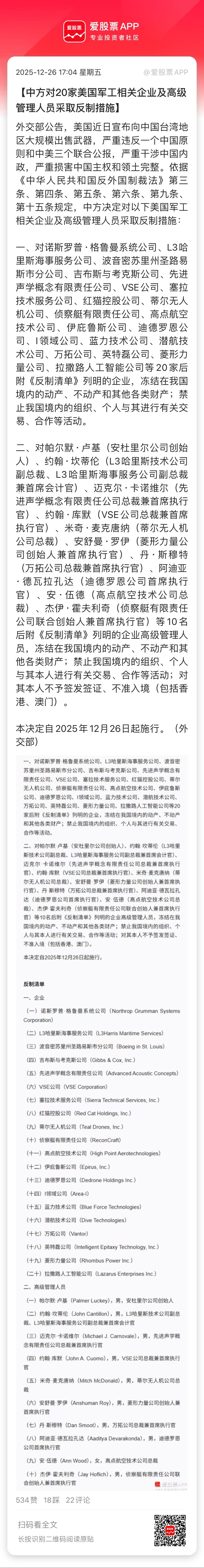 今天直接放大招反制了,对美国20家涉台军售企业实施制裁。直接诱因还是老问题:老美又在台湾问题上踩红线了,我们必须打回去! 这些企业包括洛马、波音等,一边在中国赚着大钱,另一边转头就给湾湾送武器。这就是典型“吃中国的饭,砸中国的锅”,天底下哪有这么便宜的事? 我们反制的手段很硬:冻结资产、禁止交易、不准高管入境。这就是参与对台售武企业的代价,别以为这些措施没有用,以目前中国的工业实力,这些企业不和中国发生任何联系是绝无可能的。 总之,中国在主权问题上没有任何退让空间,谁敢踩红线,就得付出代价。这个从情绪上利好军工、海峡两岸板块,看周末会不会发酵吧。