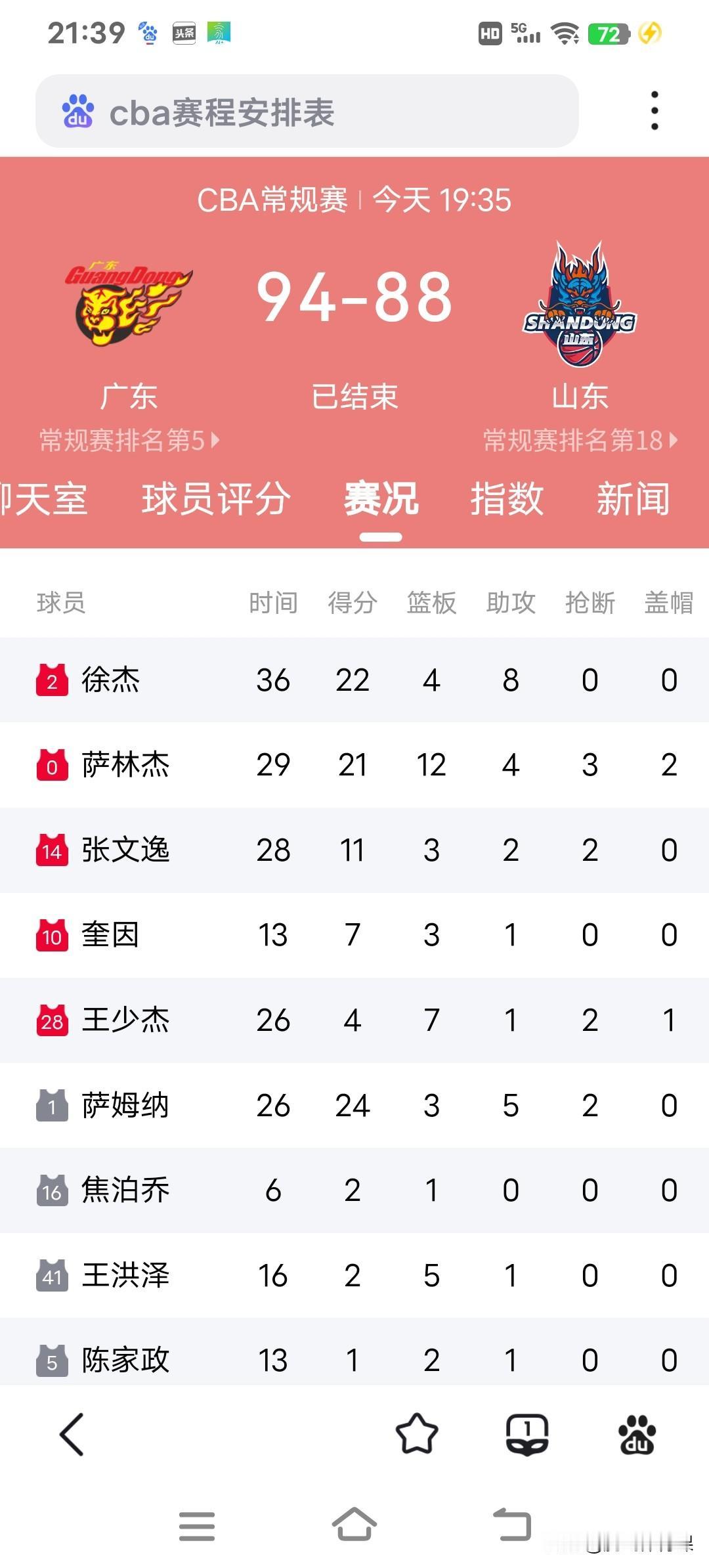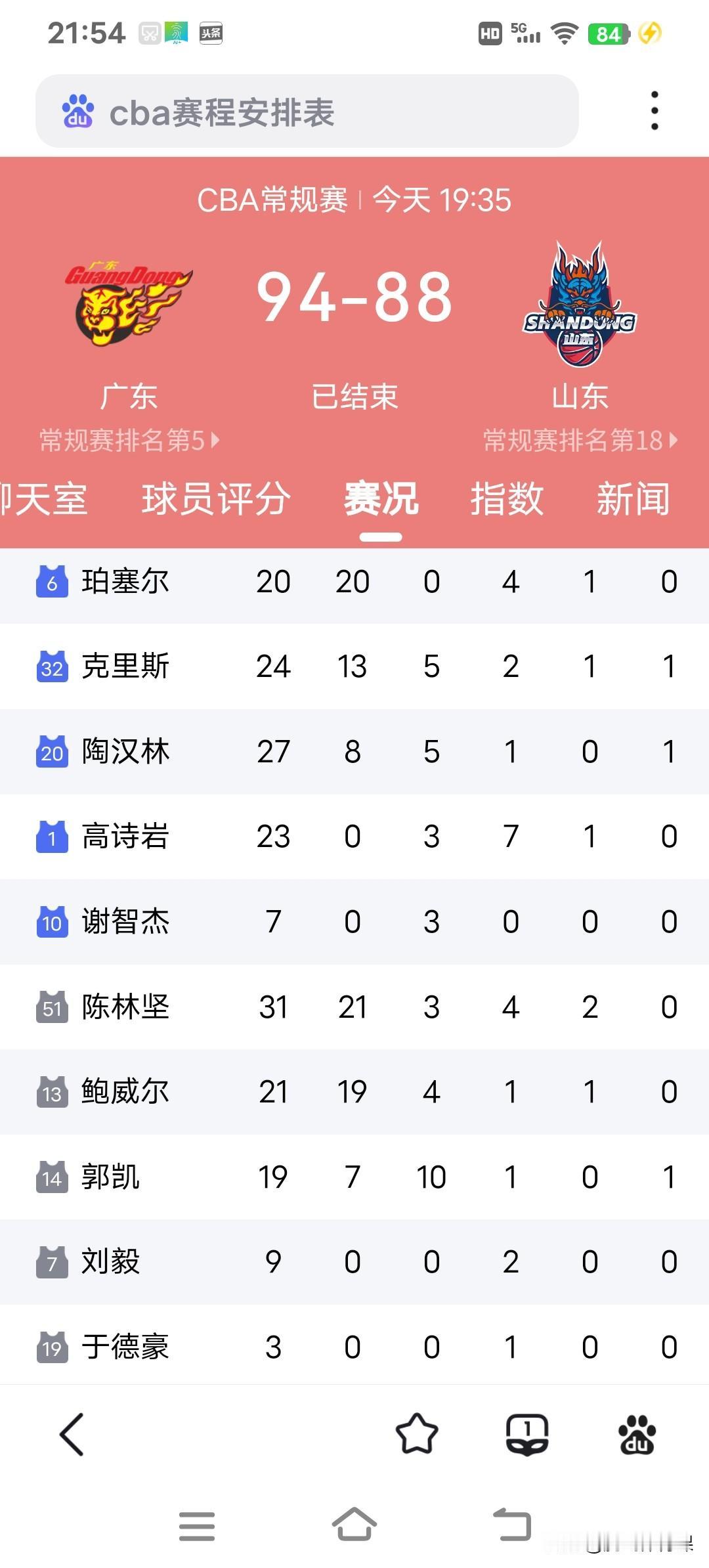 徐杰22分8次助攻,高诗岩0分,广东主场94:88击败山东迎来6连胜。 CBA