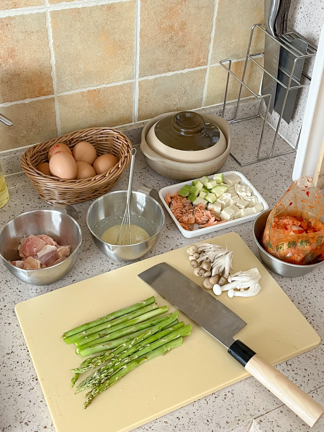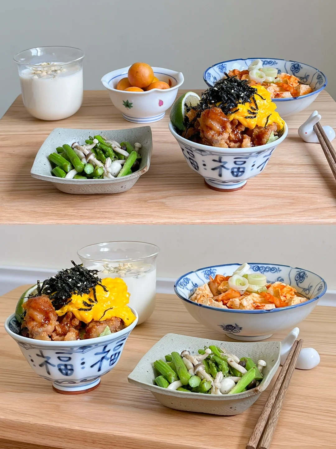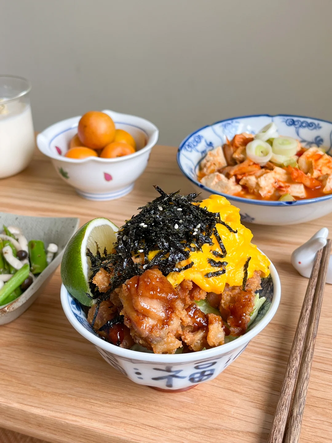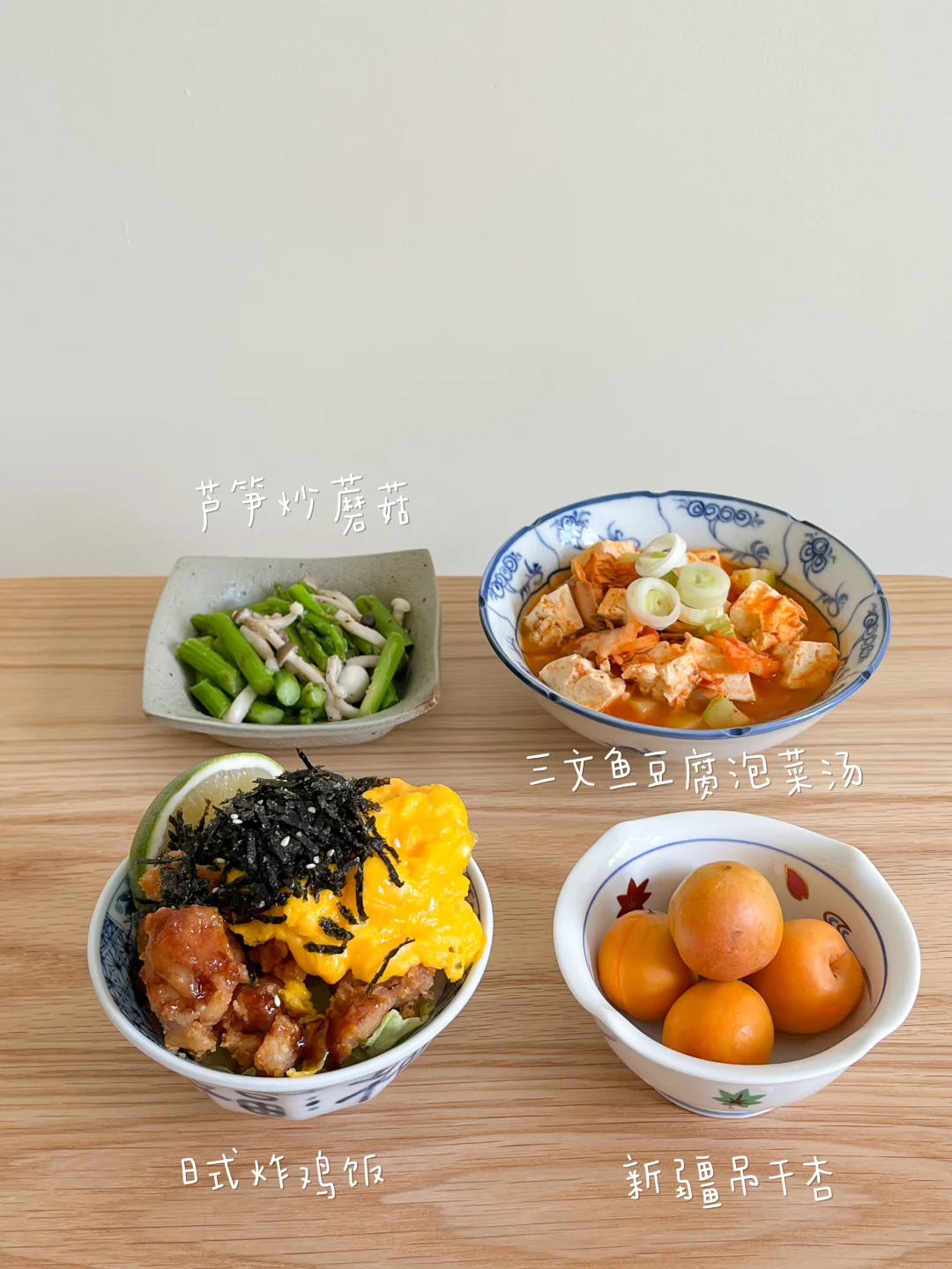 🧾今日午餐: 日式炸鸡饭🍗 三文鱼泡菜豆腐汤🥣 芦笋炒蘑菇🍄 新疆吊干杏🍑 茉莉冰豆乳🥛 今天中午用小福碗 吃福气满满的蒜香炸鸡饭 热乎乎的米饭 清脆的西生菜 还有炸的香香脆脆的鸡块 盖一张滑蛋被子 在放上海苔丝 一瓣青柠 这一碗饭可是香顶啦~~ 泡菜豆腐汤除了五花肉 用三文鱼或者金枪鱼煮也是很好喝的 时间够 就用小石锅慢慢煮 把酸泡菜和豆腐煮入味 越煮越好喝 一个人的小日子也别糊弄 美食就可以治愈一切啦