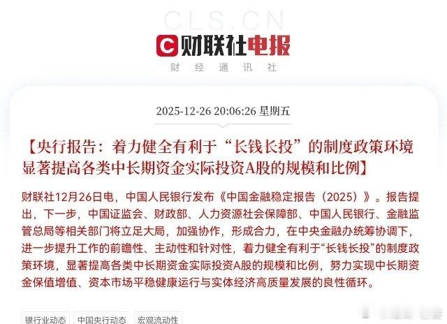 央行重磅利好!就在刚刚!央行再次释放利好消息下周一有望收中大阳线了,九连阳稳了!今日下车的恐怕要拍大腿了…晚间8点06分,央行发布《中国金融稳定报告(2025)》,报告强调要着力健全有利于“长钱长投”的制度政策环境,显著提高各类中长期资金实际投资A股的规模和比例,这是个利好消息一出,股民们又乐开花了,这对于A股来说是重大利好消息,央行这是要给大A保驾护航了,难怪在关键时刻总有神秘力量挺身而出,捍卫3800点,这就是长线长投的力量,显著提高中长期资金实际投资A股的规模和比例又能给A股带来万亿级别的增量资金,推动A股走稳,走实,走远,总而言之,央行报告传达了顶层维护资本市场稳定的强烈信号,这有助于强化和提振市场信心,是最大利好消息!股民们!坐稳扶好!受此利好消息刺激,信心十足!已经蠢蠢欲动了,不出意外的话,下周一A股又要中大阳线拔地而起,满仓的股民们,下周可以继续吃大肉了!今年人工智能核心产业规模超万亿元