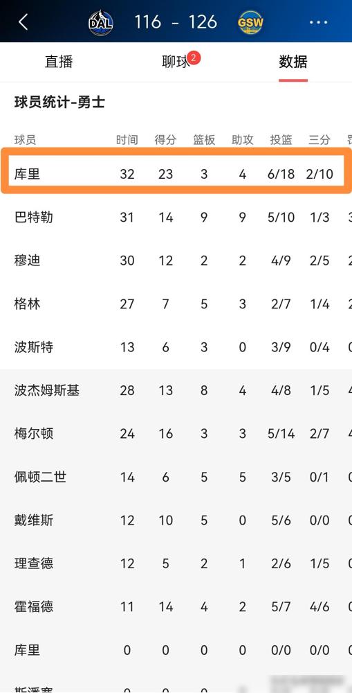 勇士当家球星库里竟然投不进三分球!在今天勇士主场以126:116击败独行侠的圣诞大战中,身为NBA历史三分王的库里竟然投不进三分球了,真是让人感到不可思议。 这场球虽然勇士最后赢了10分,但作为核心的库里打得确实有点“扎心”,招牌的准星全丢了。 他在32分钟的出场时间里,手感简直冷到了冰点,外线疯狂出手10次,结果最后竟然只进了2个三分。 全场看下来,库里18投6中的命中率相当惨淡,好在基本功还在,靠着9罚9中的罚球硬是把得分提到了23分。 我更在意的一个细节是,哪怕勇士是赢球的一方,库里的场上正负值居然是-3,这确实说明他今天在场上打得比较挣扎。 这种局面对他这种级别的射手来说太罕见了,3次失误加上低效的进攻,感觉整个人的节奏都没对上。 我觉得这可能就是圣诞大战的“魔咒”,当防守强度拉满,连历史三分王也有失灵的时候。 最戳我的一点是,即便当家球星打得这么铁,勇士居然还能稳稳收下比赛,这球队的底蕴确实够深。 只是对熬夜等看“库里时刻”的球迷来说,没等到那个满场飞奔、三分如雨的萌神,心里难免有点落差。