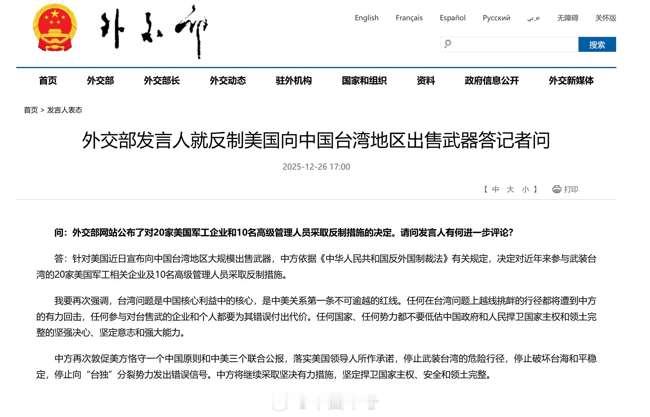 【外交部回应反制美向中国台湾地区出售武器】今天,外交部网站公布了对20家美国军工企业和10名高级管理人员采取反制措施的决定。台湾问题是中美关系第一条不可逾越红线对此,外交部发言人表示:针对美国近日宣布向中国台湾地区大规模出售武器,中方依据《中华人民共和国反外国制裁法》有关规定,决定对近年来参与武装台湾的20家美国军工相关企业及10名高级管理人员采取反制措施。我要再次强调,台湾问题是中国核心利益中的核心,是中美关系第一条不可逾越的红线。任何在台湾问题上越线挑衅的行径都将遭到中方的有力回击,任何参与对台售武的企业和个人都要为其错误付出代价。任何国家、任何势力都不要低估中国政府和人民捍卫国家主权和领土完整的坚强决心、坚定意志和强大能力。中方再次敦促美方恪守一个中国原则和中美三个联合公报,落实美国领导人所作承诺,停止武装台湾的危险行径,停止破坏台海和平稳定,停止向“台独”分裂势力发出错误信号。中方将继续采取坚决有力措施,坚定捍卫国家主权、安全和领土完整。(外交部网站)