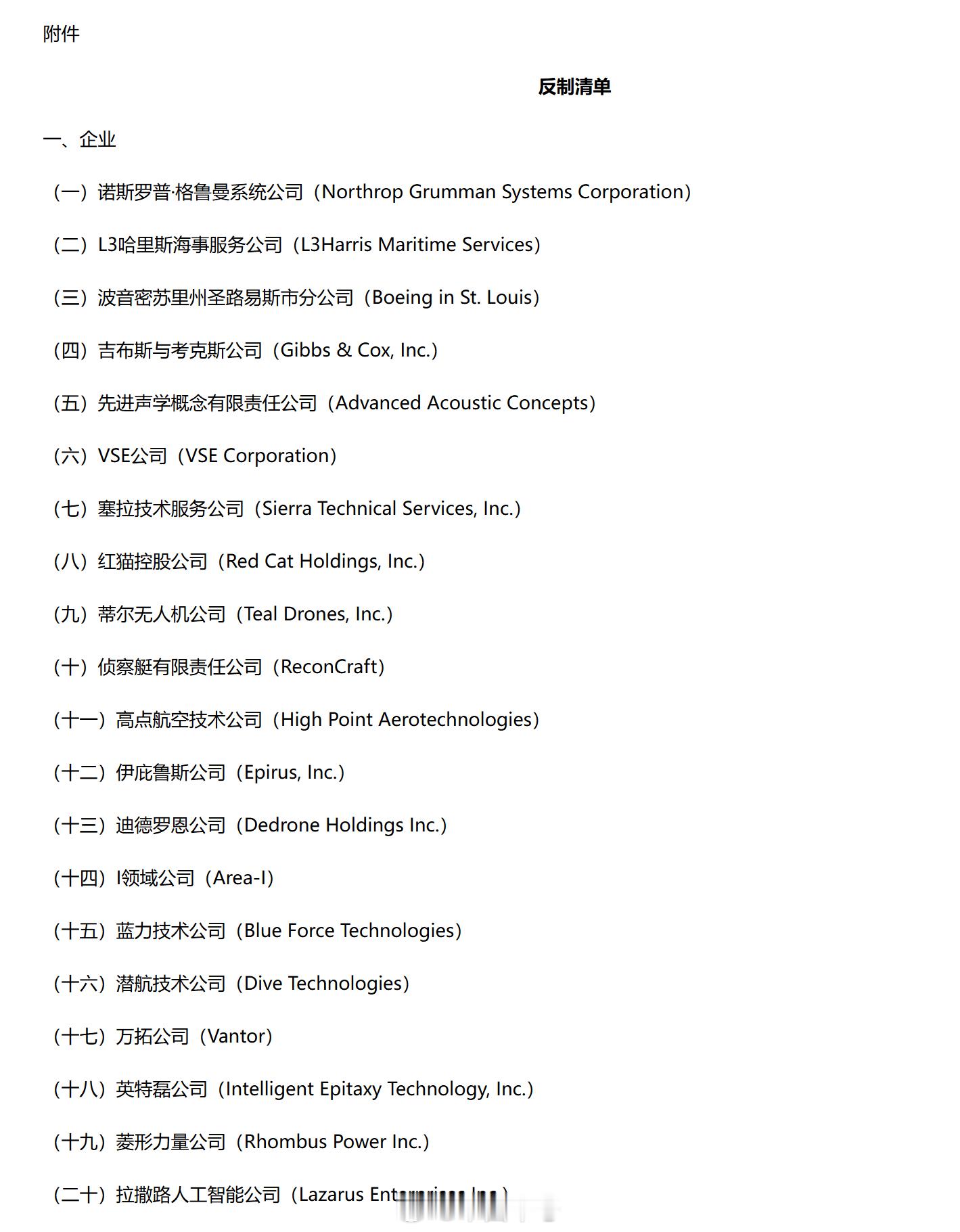 对美军工相关企业及高管人员采取反制【关于对美国军工相关企业及高级管理人员采取反制措施的决定】(2025年12月26日中华人民共和国外交部令第19号公布,自2025年12月26日起施行)美国近日宣布向中国台湾地区大规模出售武器,严重违反一个中国原则和中美三个联合公报,严重干涉中国内政,严重损害中国主权和领土完整。依据《中华人民共和国反外国制裁法》第三条、第四条、第五条、第六条、第九条、第十五条规定,中方决定对以下美国军工相关企业及高级管理人员采取反制措施:一、对诺斯罗普·格鲁曼系统公司、L3哈里斯海事服务公司、波音密苏里州圣路易斯市分公司、吉布斯与考克斯公司、先进声学概念有限责任公司、VSE公司、塞拉技术服务公司、红猫控股公司、蒂尔无人机公司、侦察艇有限责任公司、高点航空技术公司、伊庇鲁斯公司、迪德罗恩公司、I领域公司、蓝力技术公司、潜航技术公司、万拓公司、英特磊公司、菱形力量公司、拉撒路人工智能公司等20家后附《反制清单》列明的企业,冻结在我国境内的动产、不动产和其他各类财产;禁止我国境内的组织、个人与其进行有关交易、合作等活动。二、对帕尔默·卢基(安杜里尔公司创始人)、约翰·坎蒂伦(L3哈里斯技术公司副总裁、L3哈里斯海事服务公司副总裁兼首席会计官)、迈克尔·卡诺维尔(先进声学概念有限责任公司总裁兼首席执行官)、约翰·库默(VSE公司总裁兼首席执行官)、米奇·麦克唐纳(蒂尔无人机公司总裁)、安舒曼·罗伊(菱形力量公司创始人兼首席执行官)、丹·斯穆特(万拓公司总裁兼首席执行官)、阿迪亚·德瓦拉孔达(迪德罗恩公司首席执行官)、安·伍德(高点航空技术公司总裁)、杰伊·霍夫利奇(侦察艇有限责任公司联合创始人兼首席执行官)等10名后附《反制清单》列明的企业高级管理人员,冻结在我国境内的动产、不动产和其他各类财产;禁止我国境内的组织、个人与其本人进行有关交易、合作等活动;对其本人不予签发签证、不准入境(包括香港、澳门)。本决定自2025年12月26日起施行。 外交部 2025年12月26日(外交部网站)