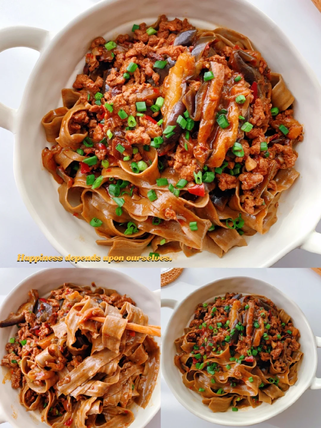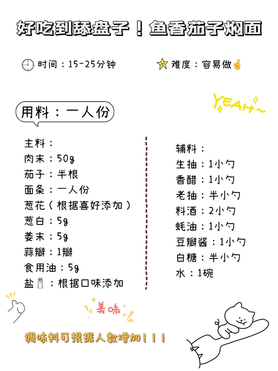 自制低Gi减脂餐,我想让减脂餐更好吃✨✨✨ [飞吻R]hi,又是快乐的一天啊❗今日分享: ----- 【鱼香茄子焖面】 ❤️食材: 主料:茄子,肉末,面条 鱼香汁:生抽1勺,老抽半勺,香醋1勺,蚝油1勺,白糖半勺,料酒1勺。 做法见图片 ❤❤小提示: ✅干面条水多一点,湿面条水少一点。 ✅茄子🍆切大一点更好吃 ✅不用放盐,蚝油,老抽,豆瓣酱里都有盐分 ✨✨又是快乐减脂的一天呀❗