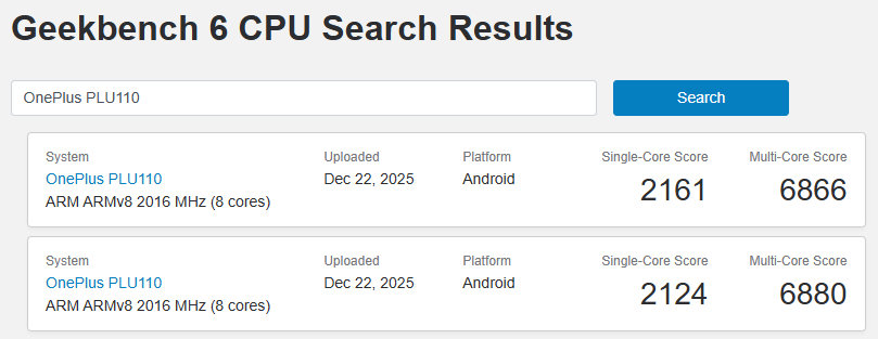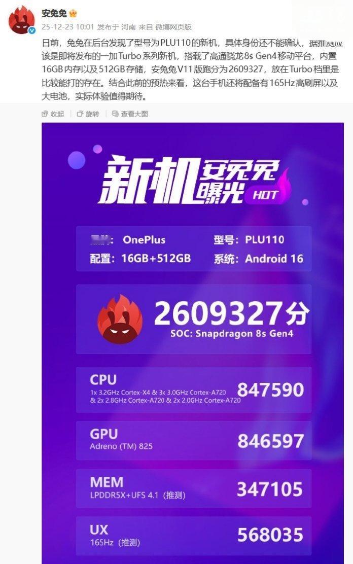 【“PLU110”新机跑分超 260 万:搭骁龙 8s Gen4 处理器,预计为一加 Turbo 系列新机】安兔兔官方发文称在后台发现了一款型号为 PLU110 的新机,具体身份还不能确认,但预计为一加 Turbo 系列新机。测试机型在安兔兔 V11 版跑分超 260 万(总分 2609327),搭载高通骁龙 8s Gen4 移动平台,系统基于 Android 16 打造,拥有 16GB+512GB 存储规格。安兔兔官方称该机 CPU 成绩为 847590,GPU 成绩为 846597、MEM 成绩为 347105、UX 成绩则是 568035。目前,该型号新机的 Geekbench 跑分也已曝光,单核最高 2161 分、多核最高 6880 分。据IT之家今日早些时候报道,一加 Turbo 新机的配置曝光,消息称新机支持《王者荣耀》144Hz 原生高帧、《使命召唤》165Hz 原生超高帧、《火影忍者》165Hz 原生超高帧。6.78"±1.5K+165Hz LTPS BOE 大直屏,骁龙 8s Gen4,9K 级大电池,独行黑 / 旷野青 / 追光银,12+256GB/12+512GB/16+256GB/16+512GB,217.25g