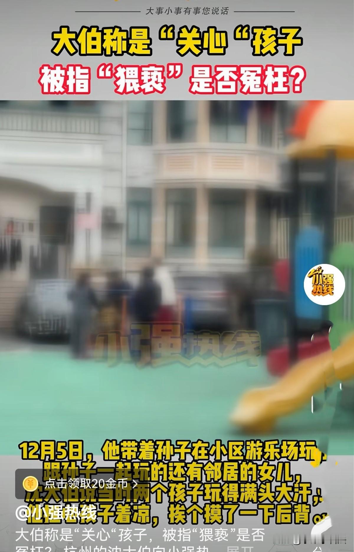 浙江杭州,孙子与一7岁小女孩在小区游乐园玩耍,爷爷来找他回家,可两个顽皮孩子跑了好几圈他才撵上。爷爷怕他们跑闪汗感冒,关心地挨个摸了下后背。谁知就这个举动,小女孩的父母竟在晚上找上门来,说爷爷猥亵了女儿,报了警。爷爷冤枉地说只摸了一下不到一秒,就是看看出没出汗!咋就疑似猥亵?记者:你不知男女有别?爷爷委屈:她只是7岁的孩子!出自好心,没那么想! 活到这把年纪,我从没跟人红过脸,更别说被警察带走,还签了啥‘疑似猥亵’的单子,真是好心没好报啊! 60多岁的沈大伯唉声叹气,满眼委屈地对记者倾述发生在他身上的烦心事。 沈大伯的阳台对着小区的游乐场,12月5号傍晚,他站在阳台看着孙子与邻居家7岁女孩在下面玩的不亦乐乎,他觉得玩的时间不短了,还叫他回家了。 于是,他下了楼去找孙子。可两个孩子玩的正高兴,不愿回家,他越叫两小孩越跑,他撵了几圈好不容易追上他们。 沈大伯觉得傍晚时分寒气袭来,怕两个孩子跑出汗闪汗感冒,便伸手摸了一把两个孩子后背,看他们出没出汗! 我就是纯粹关心孩子,怕她着凉生病,哪有半点别的心思!沈大伯比划着当时的动作,就是手掌轻轻搭在背上,一秒钟都不到就收回来了。 谁知,当天晚上小女孩的父母骂骂咧咧找上门,指着我的鼻子问我:你是不是摸我女儿后背了? 沈大伯当时就懵了,他点点头确实摸了,随后解释说是看两个孩子出没出汗,怕着凉,还赶紧解释是怕孩子着凉。 可小女孩父母铁青着脸骂他猥亵了女儿,并说已报了警,说他为老不尊。 沈大伯这个委屈啊,活了大半辈子,一直本本分分做人,怎么照顾孙子,顺便照顾了下和他一起玩的孩子就被说成猥亵了? 他反复琢磨,就算考虑不周,可自己也是一片好心啊! 民警将沈大伯带去派出所协助调查。“到了派出所,民警问得特别细,摸了哪里、摸了多长时间、当时怎么想的,我都一一说了。” 沈大伯回忆,他明确告诉民警,就摸了小女孩的后背一下,也就不到一秒钟,纯粹是关心孩子。 可调查结束后,民警让他签一份文件,上面写着“疑似猥亵”。 沈大伯想着“疑似”就是没定论,也没有证据证明自己有问题,就签了字,还被要求拍了照。 他安慰自己,身正不怕影子斜,派出所肯定能查清楚,还自己一个清白。 可心里还是七上八下的,总觉得这事儿太荒唐了!便找记者倾诉自己的遭遇。 记者问沈大伯,你不知男女有别吗?他很无奈地说:她只是个7岁的孩子,就跟自家孩子一样,当时也没多想啊!谁知道摸下就有罪了? 记者在沈大伯家看到,客厅阳台装着一个摄像头,镜头正好对着小区游乐场。 沈大伯调出12月5日的监控画面给记者看,可就在孩子们跑到游乐场边缘时,因摄像头设置的是近距离拍摄模式,后续的画面中断了,没能拍到沈大伯摸孩子后背的瞬间。 “要是摄像头能多拍点范围,就能看清当时的情况了,也不会有这么多误会。”沈大伯看着监控画面,无奈地摇了摇头。 据邻居介绍,小女孩一家是租客,记者上门时,家里没人。房东告诉记者,他只知道租客家里有2个女孩,具体情况不太了解,也没有孩子父亲的联系方式。 社区居委工作人员透露,小女孩的父亲一开始态度非常强硬,毕竟涉及到自己的孩子,做家长的担心、生气都能理解。 工作人员说,他们一直在从中调解,跟双方沟通,希望能大事化小、小事化了。 事发地点的公共视频已经调取出来,并且提交给了警方,目前就等着警方进一步调查核实。 记者随后联系了当地警方,民警表示,目前案件正在进一步调查中,公安机关会依据调查核实的事实,依法作出公正处理。 《刑法》第237条规定:猥亵儿童的,处五年以下有期徒刑;有下列情形之一的,处五年以上有期徒刑:   (一)猥亵儿童多人或者多次的;   (二)聚众猥亵儿童的,或者在公共场所当众猥亵儿童,情节恶劣的;   (三)造成儿童伤害或者其他严重后果的;   (四)猥亵手段恶劣或者有其他恶劣情节的。 本案中,沈大伯触摸小女孩后背,主观上是担心孩子出汗着凉,仅为长辈对孩童的正常关心;客观上只是手掌短暂轻搭后背,时长不足1秒,无任何恶劣猥亵手段,也未对女童造成身体伤害、心理损害等后果,应不符合猥亵儿童罪的构成要件。 警方标注“疑似猥亵”仅为调查阶段的临时定性,并非最终定罪,需结合完整证据链明确事实后再判定。 《治安管理处罚法》第42条第2项规定,公然侮辱他人或者捏造事实诽谤他人的,处5日以下拘留或者500元以下罚款…… 因过度担心孩子,未核实事实就贸然指控、辱骂沈大伯,捏造事实诽谤其“为老不尊”,虽未达到刑事犯罪标准,但已侵犯沈大伯名誉权,需接受治安处罚,同时还需承担赔礼道歉、恢复名誉等民事责任。 有人说,老人家对孩子都是这样对待,这是关心、善良的行为,好心人! 也有人说,人心变了,怎么想的都有,多一事不如少一事吧!远离是非! 您觉得老人是否冤枉呢?