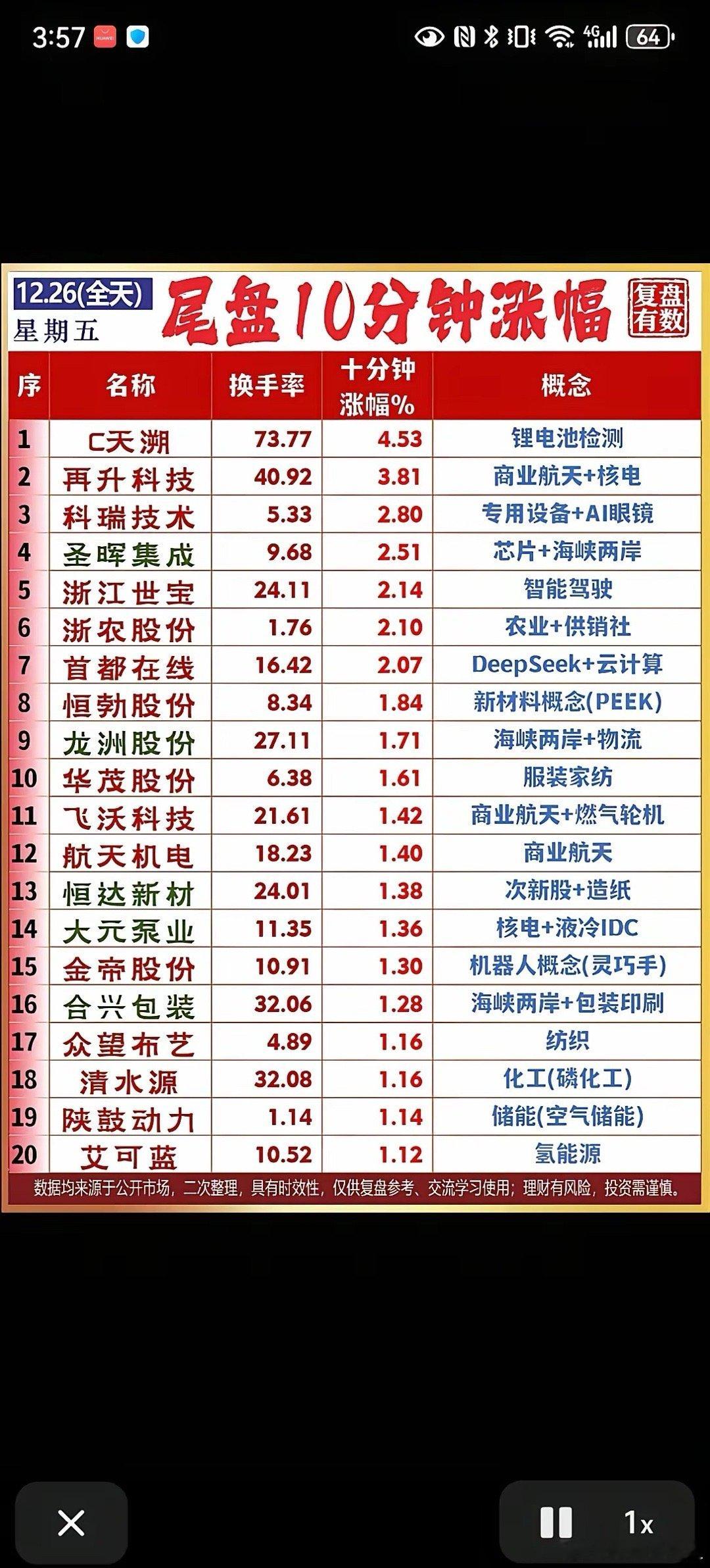 12月26日,周五A股尾盘10分钟这些股票遭抢筹!!!次新股天溯尾盘10分钟上涨4.53%,锂电池检测概念股,下周走势如何值得期待;再升科技尾盘10分钟上涨3.81%,商业航天叠加可控核聚变概念,后市值得期待;科瑞技术尾盘10分钟上涨2.80%,AI眼镜概念,后市值得重点关注;圣晖集成尾盘上扬2.51%,芯片叠加海峡两岸概念,后市值得高看一眼;浙江世宝尾盘拉升2.14%,作为近期热门的智能驾驶概念股,后续利好消息可能进一步刺激上涨;让我们拭目以待吧!!