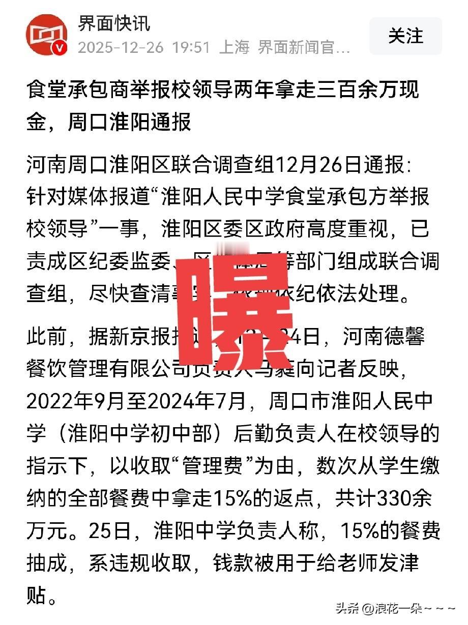 曝!真是罕见的事! 这个食堂承包商真有良心啊!竟然举报校领导?食堂承包商举报校领导两年拿走三百余万现金! 事发地为周口淮阳区,你们说这个事情是不是有点罕见?给我的第一感觉是这个承包商不想在当地做生意了吗? 当然了,这个事情还在调查,调查结果还不太清楚,但是看看他所举报学校拿15%的提成,这也太高了吧,承包商再赚点钱,到孩子嘴里还有多少钱?这都是孩子们的口粮钱,你多提成一块钱,孩子们就少吃一块钱嘛,太不地道了!静等调查结果吧。哎!