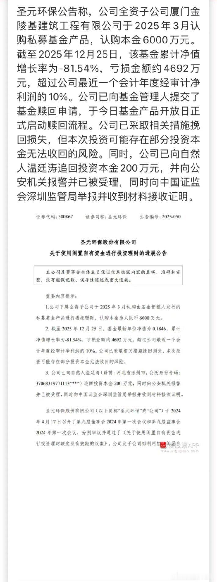 圣元环保子公司斥资6000万元认购私募基金,短短9个月时间,该笔投资竟亏损81%。令人费解的是,今年A股身处牛市行情,如此惨重的亏损实在不合常理。也难怪公司会向公安机关报案,这大概率是遭遇了私募杀猪盘。要知道,若是正规私募产品,在牛市背景下绝不可能出现这般离谱的亏损幅度。对此,有观点猜测,亏损原因不外乎三点:其一,重仓衍生品交易导致爆仓;其二,资金被挪用于为他人高位接盘;其三,私募方与相关主体存在不为人知的抽屉协议。由此可见,国内私募行业乱象仍存,投资者需擦亮双眼、谨慎入局。与其把资金交给不靠谱的私募,倒不如自己下场炒股,至少还能收获实打实的情绪价值。