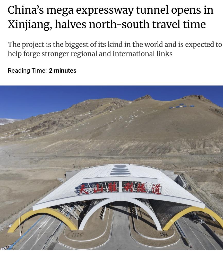 外媒:12月26日,世界最长高速公路隧道——新疆天山胜利隧道正式通车。该隧道长22.13公里,是乌鲁木齐至库尔勒高速公路的关键部分,将穿越天山山脉的车程缩短至20分钟,使乌鲁木齐到库尔勒的旅行时间从7小时以上缩短至3.5小时左右。 隧道建设历时五年,攻克了复杂地形和环境的诸多挑战,还创造了两项世界纪录:最长高速公路隧道和最深公路隧道竖井。