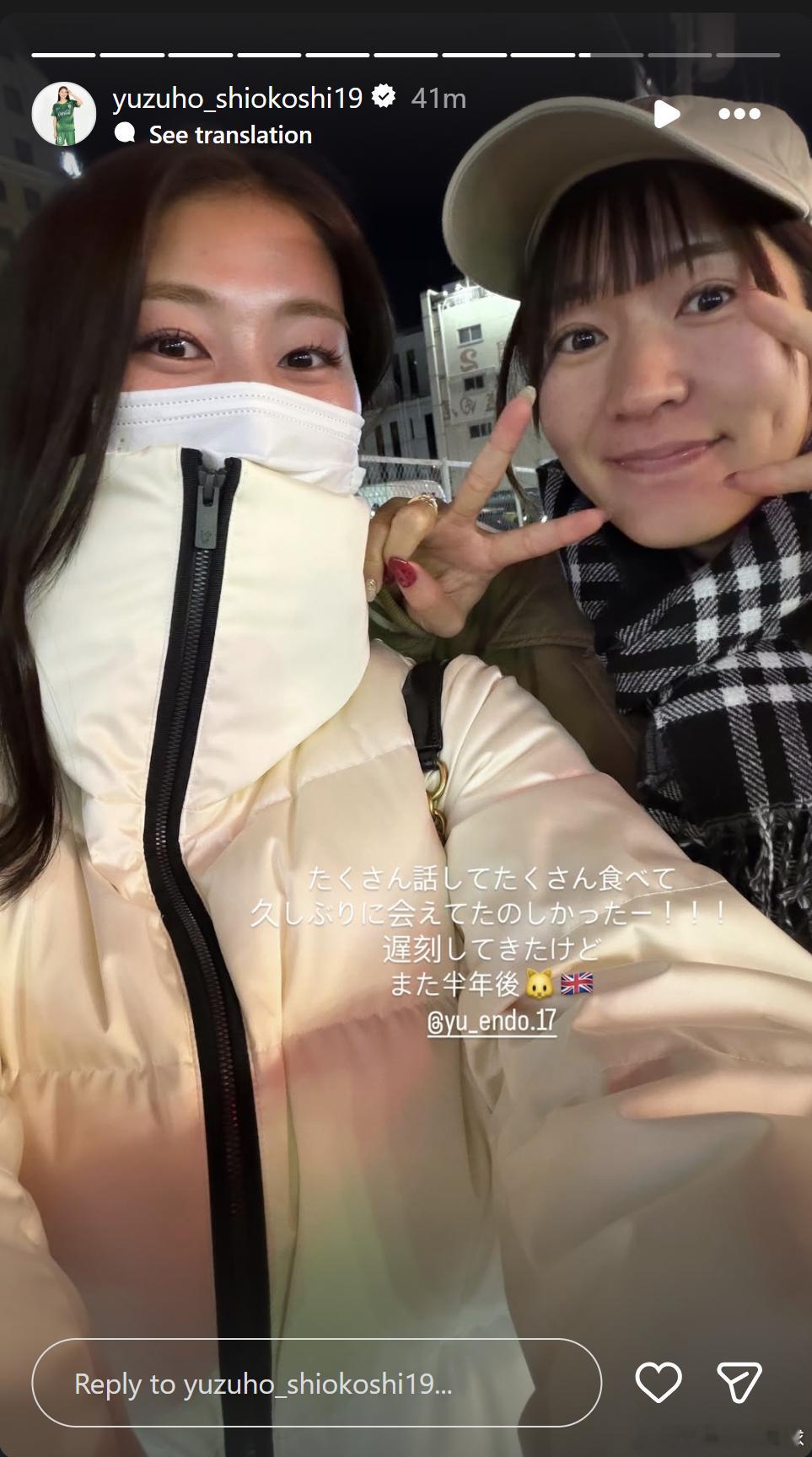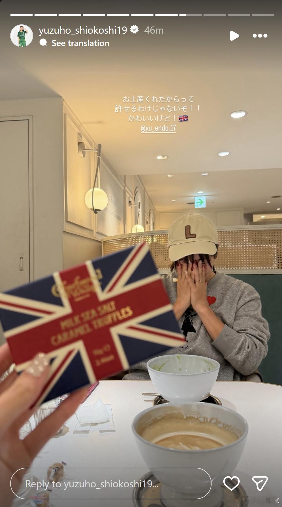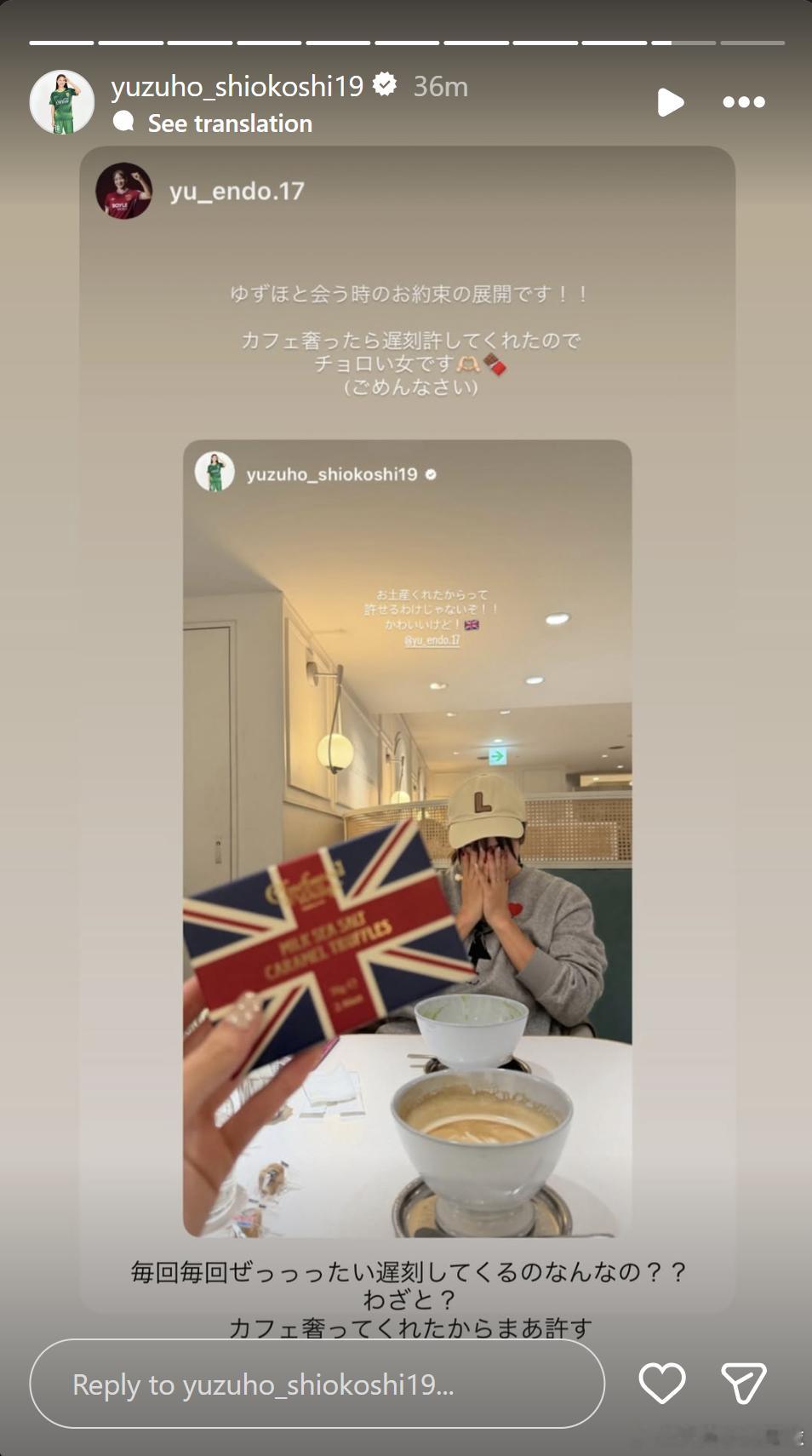 [元浦和公主]-4更新分开六个月后的初次会面。不出所料,遠藤優又姗姗来迟,并持续刷新该项纪录🤦♀️。赠送了可爱的英伦土特产💝,似乎没有得到塩越柚歩的谅解。又请塩越柚歩喝了咖啡,勉强得到对方原谅。再见又是半年后。