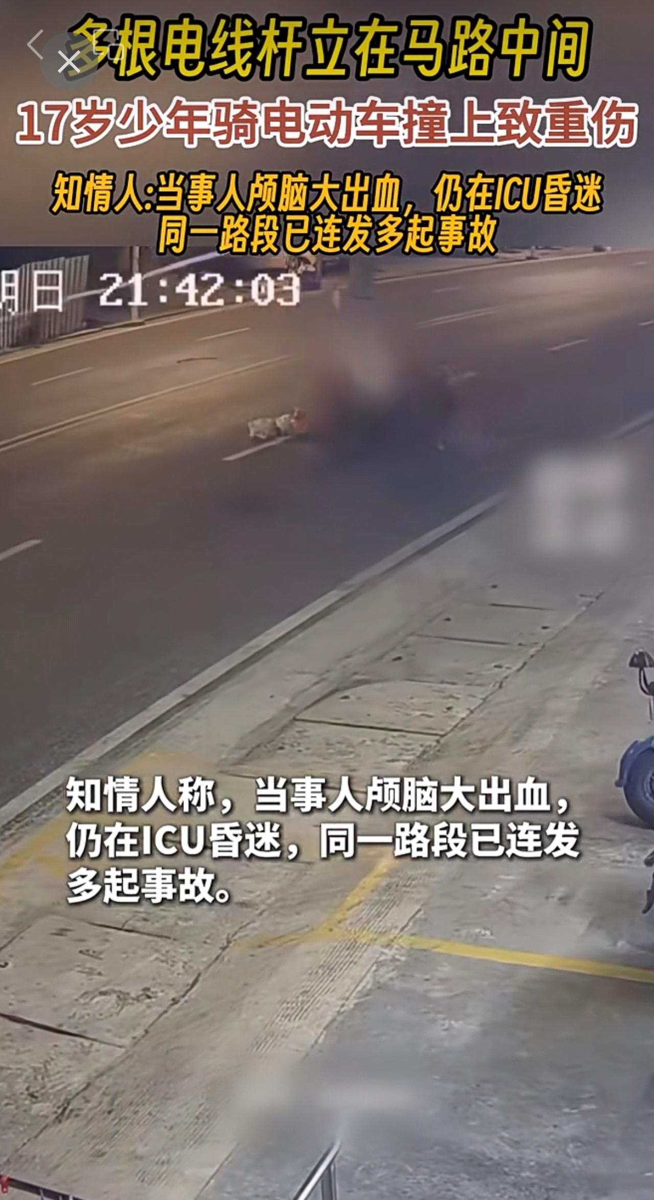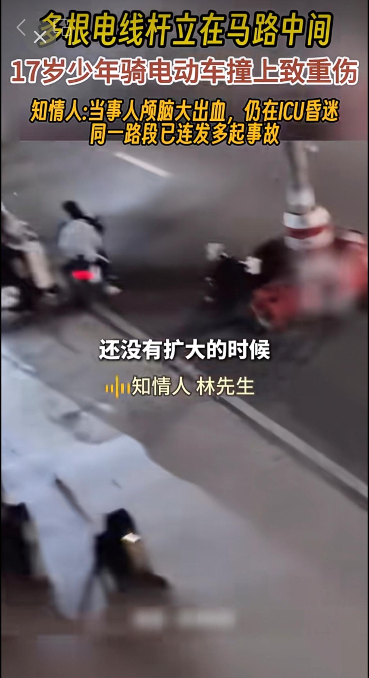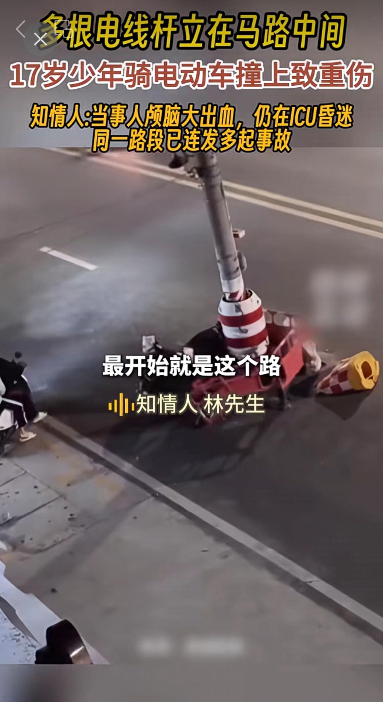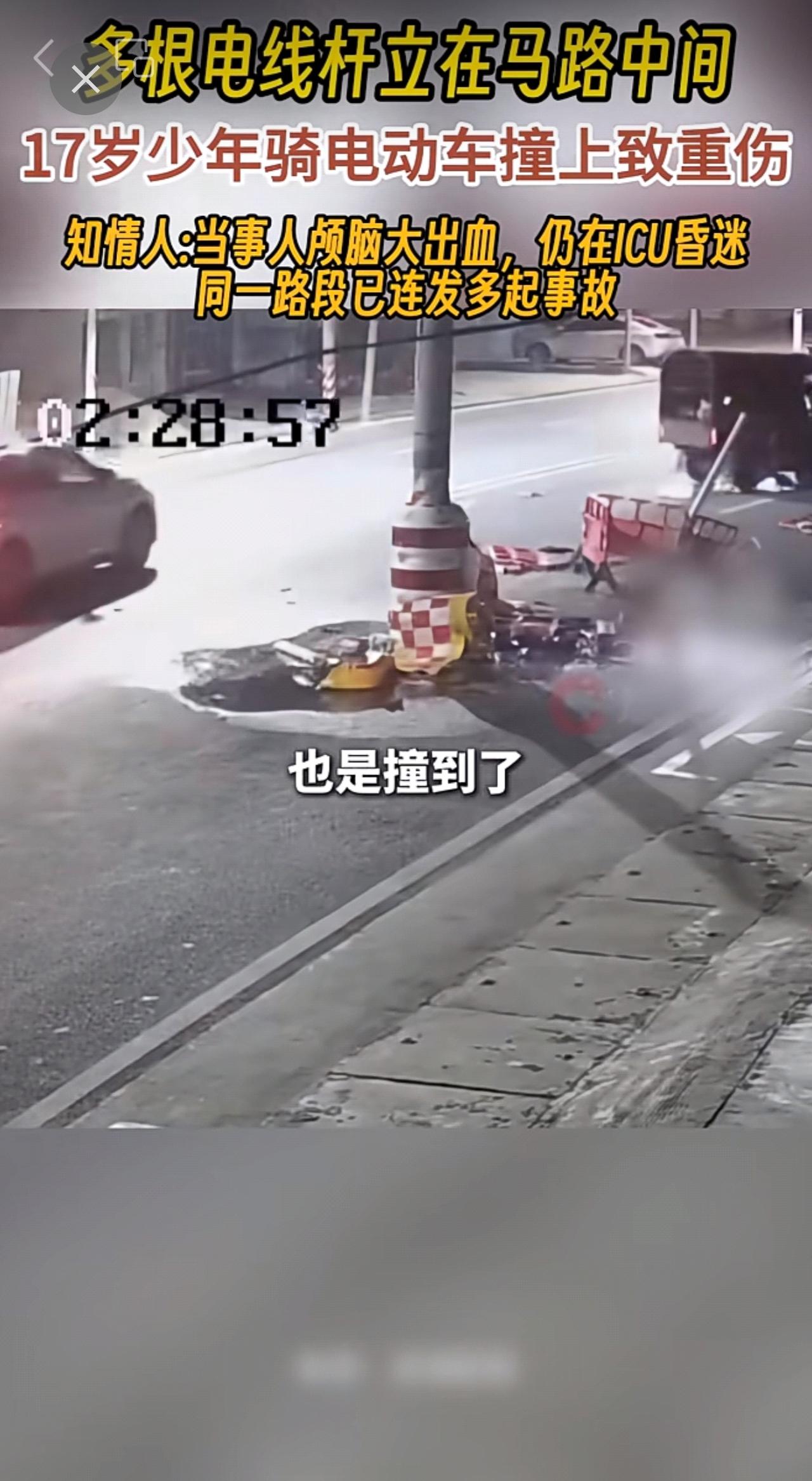 多根电线杆立在马路中间,17岁少年骑电动车撞上致重伤,知情人:当事人颅脑大出血,仍在ICU昏迷同一路段已连发多起事故。