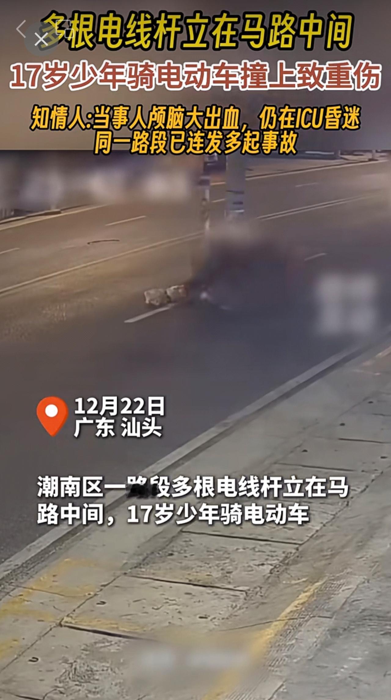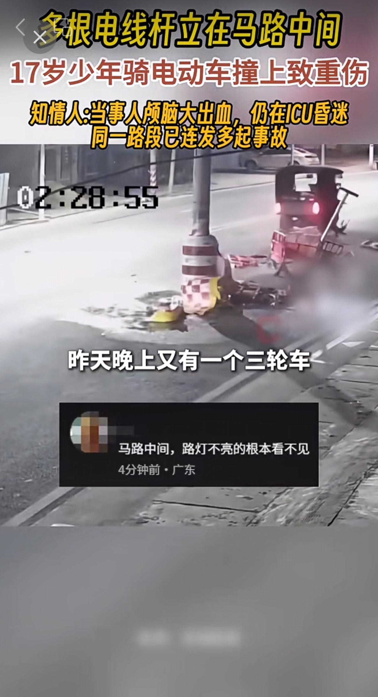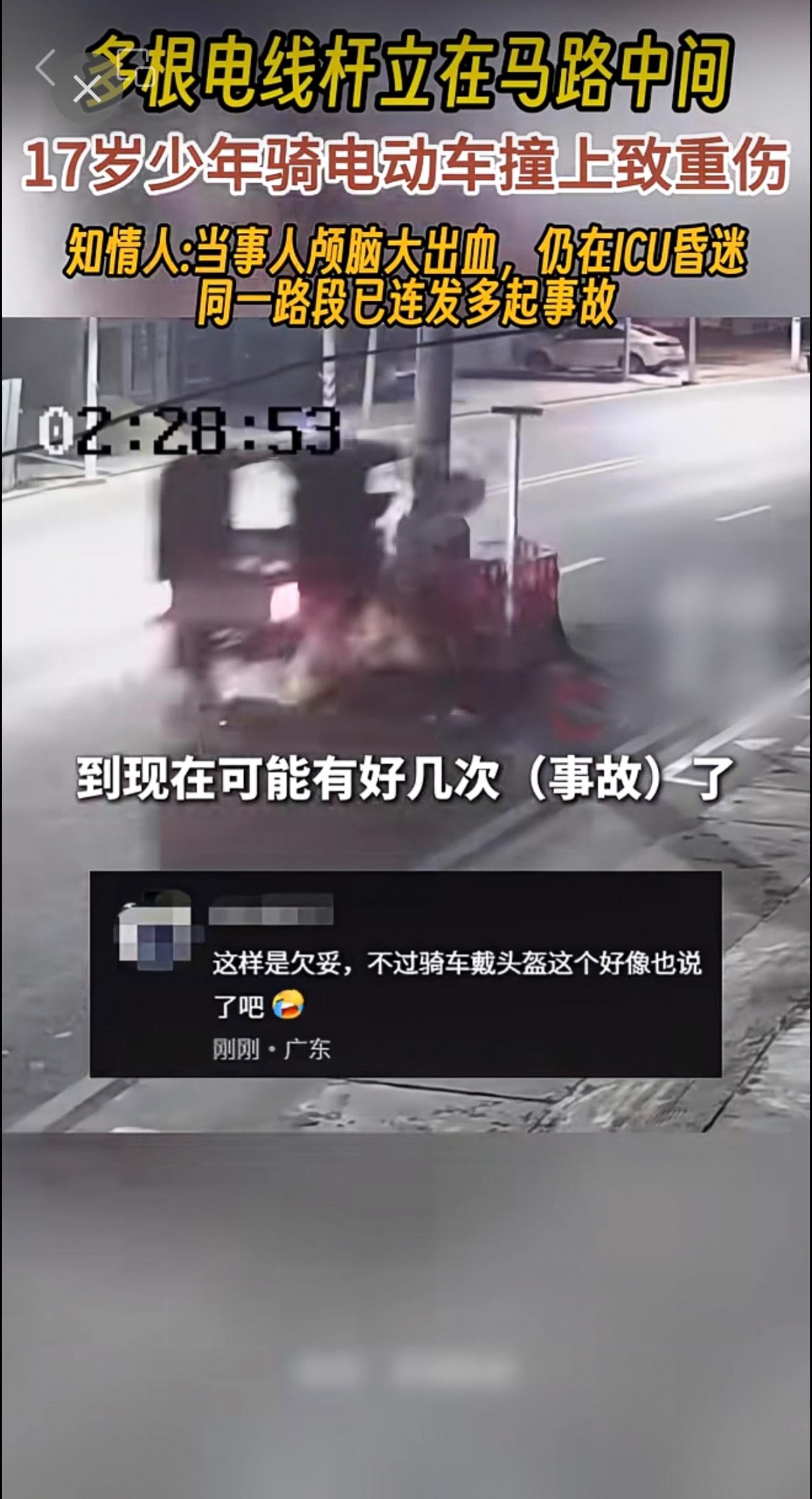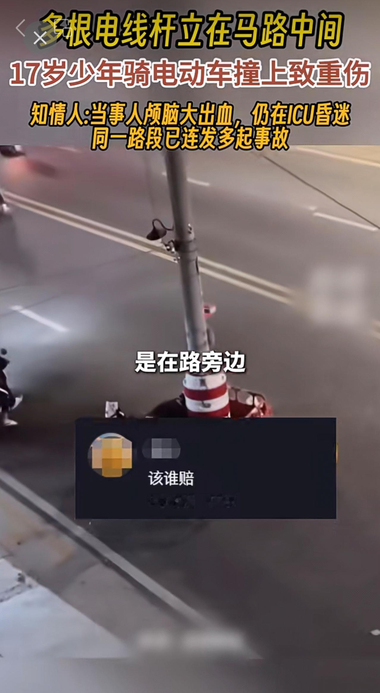 多根电线杆立在马路中间,17岁少年骑电动车撞上致重伤,知情人:当事人颅脑大出血,仍在ICU昏迷同一路段已连发多起事故。