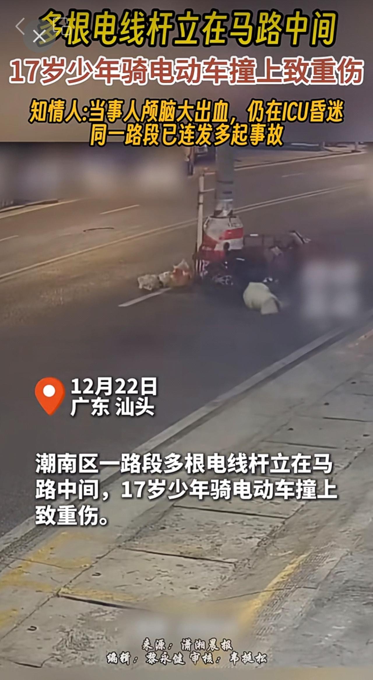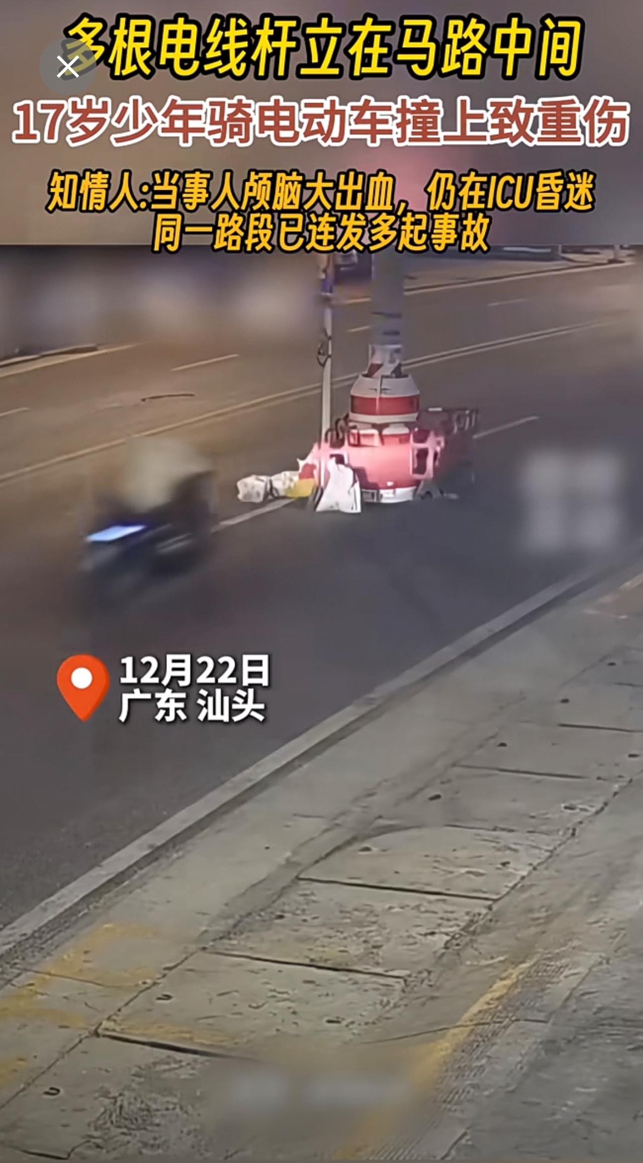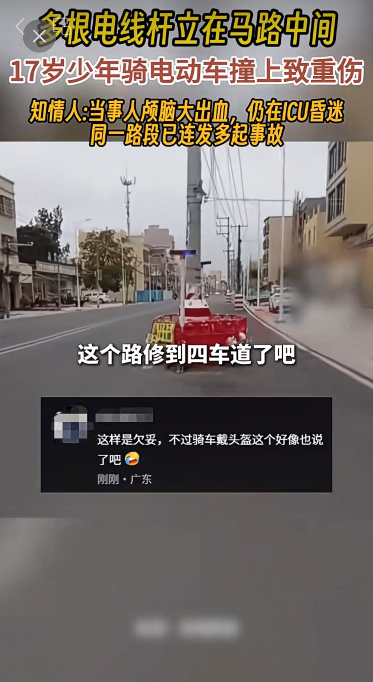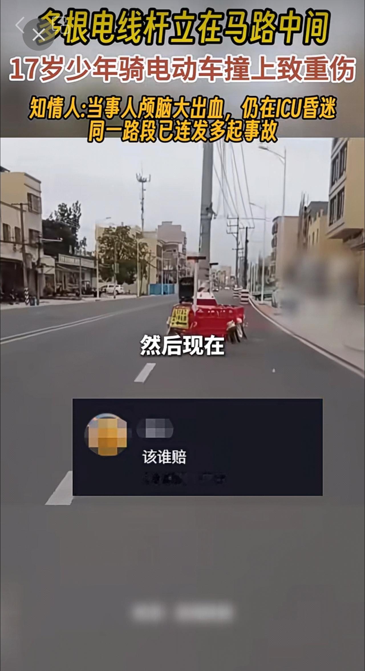 多根电线杆立在马路中间,17岁少年骑电动车撞上致重伤,知情人:当事人颅脑大出血,仍在ICU昏迷同一路段已连发多起事故。