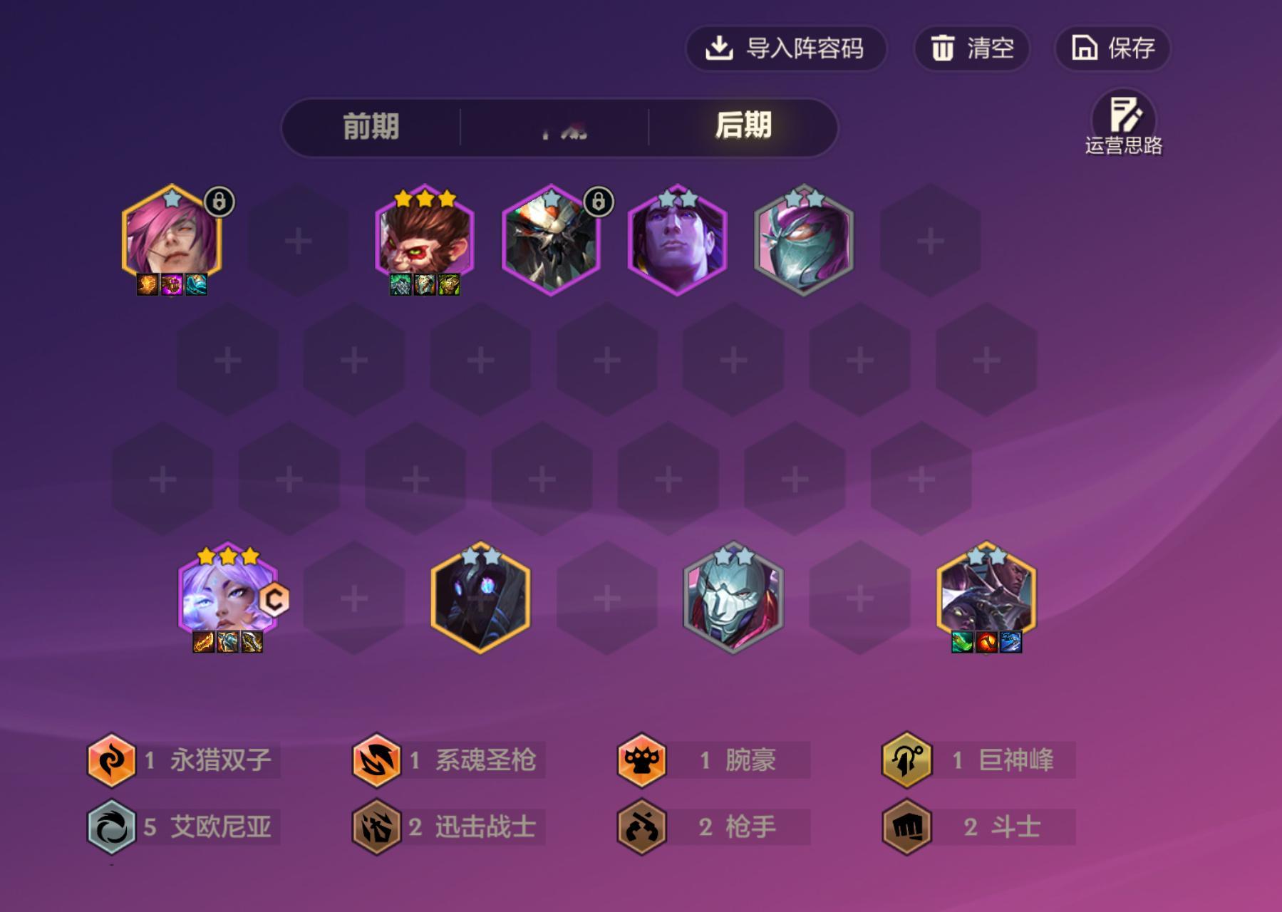 「艾欧95」。开局艾欧繁荣之路,就可以启动。大成后可以和诺克95掰掰手腕,。前期:3艾欧+枪手斗士凑羁绊。速升8级,解锁瑟提。芸阿娜+坦克2星后,可以存钱上9。装备:优先芸阿娜三件套:羊刀+海妖+无尽。其次给猴子做肉装。猴子蝎子宝石谁3星,谁主T。蝎子宝石也可以替换为稻草人龙女。 金铲铲