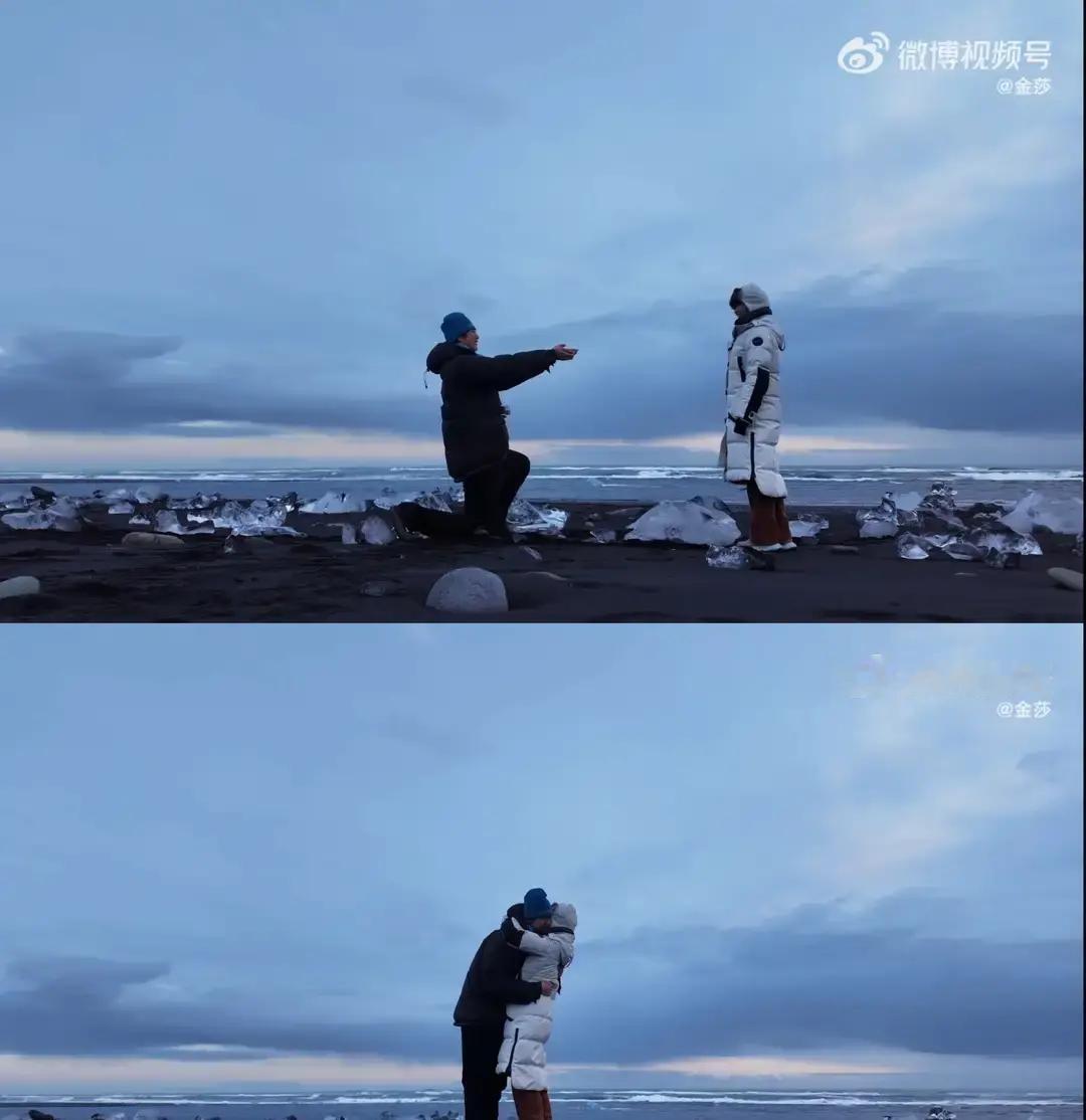 金莎在冰岛被小19岁的孙丞潇跪地求婚,视频里她哭成泪人,点头那一下全网刷屏。 两
