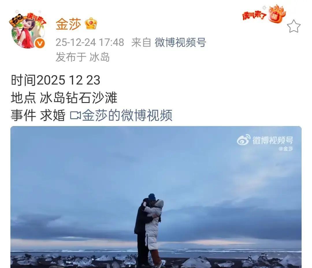 金莎在冰岛被小19岁的孙丞潇跪地求婚,视频里她哭成泪人,点头那一下全网刷屏。 两人因恋爱综艺结缘,节目结束一年多,同框被拍无数次,始终没松口,这次直接甩出钻石沙滩戒指吻,热搜两小时破三亿。 我刷到那条极光下的拥抱,第一感受是姐姐终于把质疑声甩在身后,19岁差又怎样,她大大方方说愿意,他紧张到手指发抖,镜头里全是真心。 网友从唱衰变祝福,只隔了一场求婚,流量和好感一起暴涨,男方咖位瞬间飞升,品牌方已经开始打听合体报价。 姐弟恋走到订婚,比剧本带劲,现实版“风雪是你,平淡是你”谁不爱看。 爱情赢给勇气,也赢给时间。 敢在镜头前承诺余生,就把流言踩成红毯。 祝他们别把浪漫留在冰岛,把日子也拍成续集。