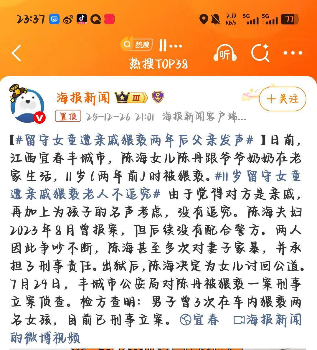 亲戚+名声,11岁留守女童遭亲戚wx老人不追究,不要让所谓的名声,用沉默放任毁了孩子的一生! 2023年,11岁留守女童在江西丰城被亲戚在车内实施3次wx,另有一名女孩同遭侵害,祖父母因施害者为亲戚且顾虑“名声”,初期选择沉默。 女孩父母虽于2023年报案但未配合调查,更是因为这件事引发jb离婚,父亲陈海因jb入狱,出狱后,陈海决定为女儿讨回公道。 2025年7月29日,丰城市公安局刑事立案,检方查明wx事实,案件进入司法程序。 这个案件最让人绝望的不是禽兽亲戚的恶行,而是至亲长辈用“名声”二字,亲手将孩子推向二次伤害的深渊。 他们眼里的“家丑不可外扬”,是对加害者最无耻的包庇;他们口中的“顾全脸面”,是对孩子身心创伤最残忍的漠视。孩子在恐惧中求助,换来的却是亲人的沉默,这份来自至亲的背叛,远比禽兽的恶行更刺骨。 “亲戚”从来不是罪恶的保护盾,所谓的“名声”更不该成为掩盖恶行的遮羞布。这些长辈的沉默,是对施害者的纵容,更是对孩子的二次伤害。留守儿童群体长期缺乏父母陪伴,性教育严重缺失,他们本就是需要重点守护的弱势群体。 性教育的普及,从来不是只教给孩子,更要教给每一个成年人——教他们认清罪恶的模样,教他们懂得保护孩子才是天大的事,教他们明白沉默不是顾全大局,而是助纣为虐。 每一个女孩,都值得在阳光下被好好呵护长大,不容任何人以任何名义践踏。