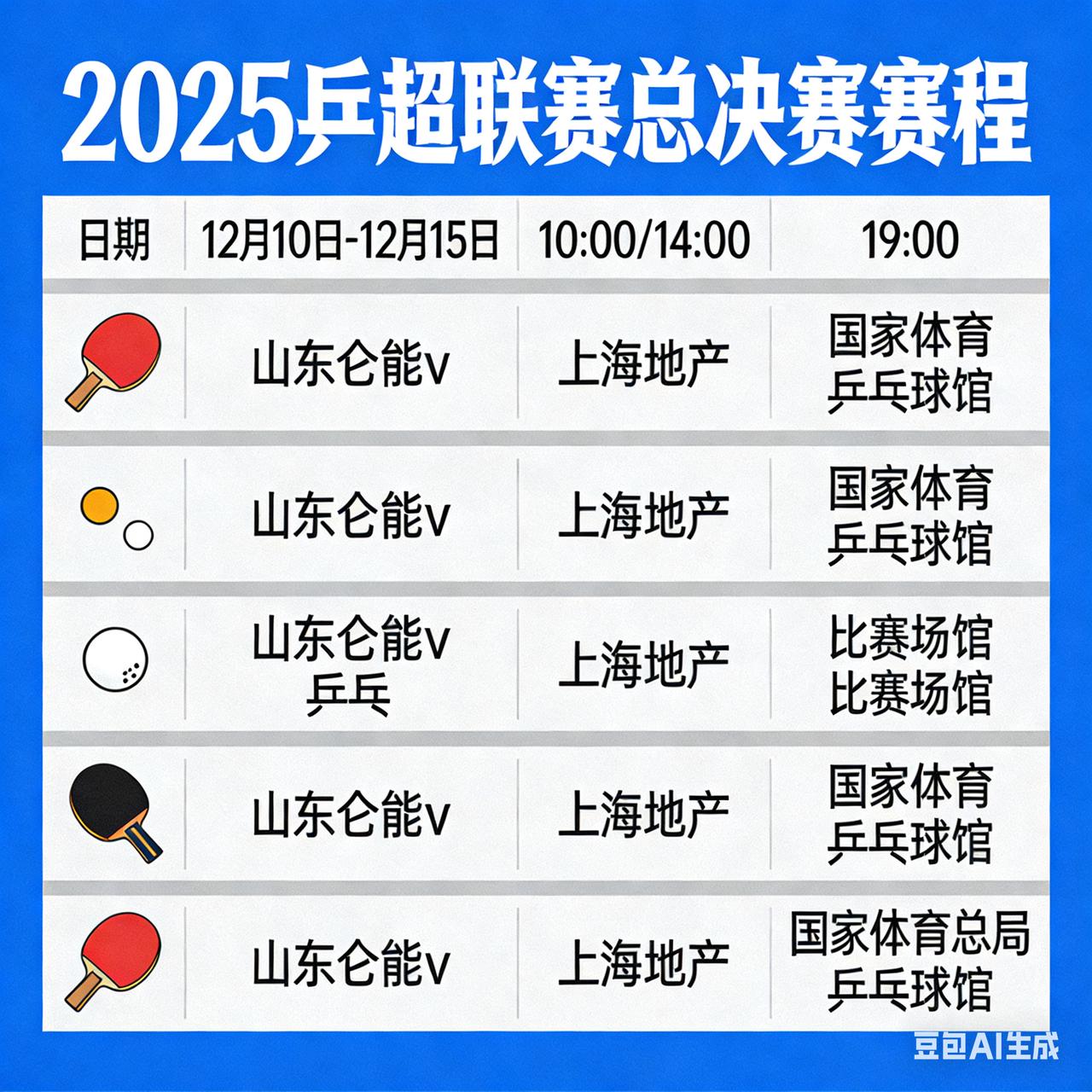 乒乓盛宴来袭!2025乒超总决赛明日开战,赛程+焦点对决全攻略,收藏不迷路 终于等来了!2025中国乒乓球俱乐部超级联赛总决赛将于12月26日在南京青奥体育公园体育馆正式开打,为期3天的巅峰对决+国少新星选拔赛同步上演,乒乓迷们速速码住这份观赛攻略,精彩场次不错过! 🌟 赛事核心亮点抢先看 1. 四强集结,冠军悬念拉满 经过多轮厮杀,男、女团体4强尘埃落定,阵容堪称“神仙打架”: - 男团4强:山东魏桥·向尚运动、黄石基地·华新、上海地产集团、汕头明润,老牌劲旅与黑马球队同台竞技,每一场都是强强碰撞; - 女团4强:深圳大学、山东鲁能、上海龙腾、华东理工大学,顶尖女将们将展开针尖对麦芒的较量,谁能登顶年度王座备受瞩目。 2. 国少新星同步亮相,见证未来可期 除了成年组的巅峰对决,2025国少集训队选拔赛决赛也将同期举行!7-10岁男女子组的小将们将登场献技,从7岁组的程子赫VS陈子昂、宋紫依VS李晓,到10岁组的姜轩宇VS徐梓洋、张隽月VS何羽欣,一批乒乓后备力量正在崛起,说不定能看到未来世界冠军的青涩模样~ 📅 必看赛程表(精准到时段,建议收藏) 日期 黄金时段 核心赛事 对阵情况 12月26日(周五) 11:00 女团半决赛 深圳大学 VS 上海龙腾 19:00 女团半决赛 山东鲁能 VS 华东理工大学 12月27日(周六) 11:00 男团半决赛 黄石华新 VS 汕头明润 19:00 男团半决赛 山东魏桥·向尚运动 VS 上海地产集团 12月28日(周日) 11:00 女团总决赛 半决赛胜者巅峰对决 19:00 男团总决赛 半决赛胜者终极PK 注:每日9:00、17:00还将安排国少各年龄组决赛,想看小将风采的可以提前锁定! 🔥 焦点场次前瞻,这些对决不容错过 - 12月26日19:00 山东鲁能VS华东理工大学:女团强强对话,技术与战术的双重比拼,大概率会诞生总决赛的“种子选手”; - 12月27日19:00 山东魏桥·向尚运动VS上海地产集团:男团夺冠热门之争,顶尖男单选手的直接对话或将决定比赛走向; - 12月28日19:00 男团总决赛:年度终极之战,冠军归属尘埃落定,颁奖仪式同步上演,见证荣耀时刻。 📍 观赛小贴士 - 比赛地点:南京青奥体育公园体育馆,线下观赛可提前查询票务信息; - 线上渠道:关注官方直播平台,实时锁定精彩赛事,错过直播可看回放; - 互动福利:总决赛期间大概率会有球星互动、签名环节,乒乓迷们可以多多关注官方动态。 从国少新星的青涩对决到成年组的巅峰争霸,为期3天的乒乓盛宴注定精彩不断!你最看好哪支球队夺冠?期待哪位小将的表现?欢迎在评论区留言讨论,一起为喜爱的球队和选手加油呐喊~