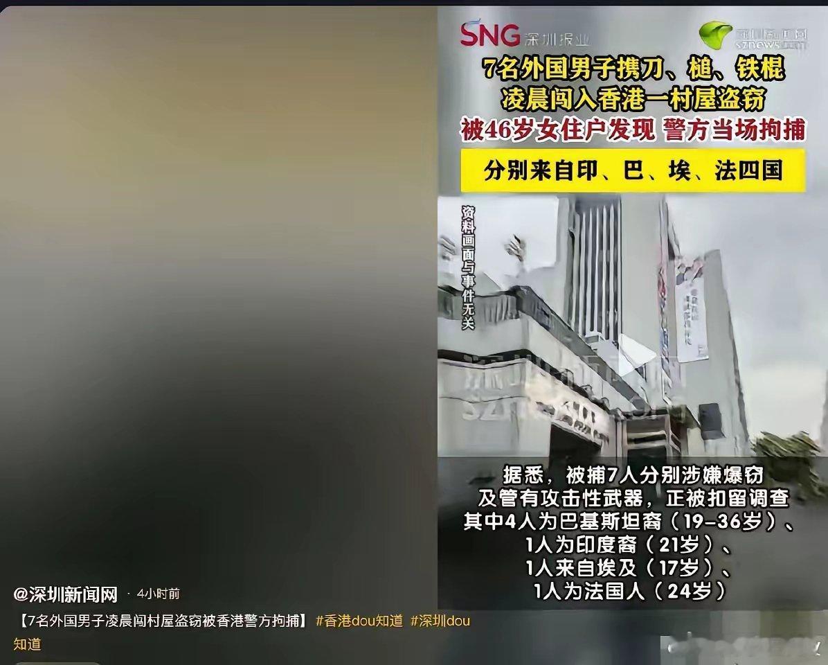 7名外国男子组团在凌晨闯入香港一村屋盗窃,并且携带攻击性武器,被警方拘捕。其中,巴基斯坦4人,印度,埃及,法国各一人