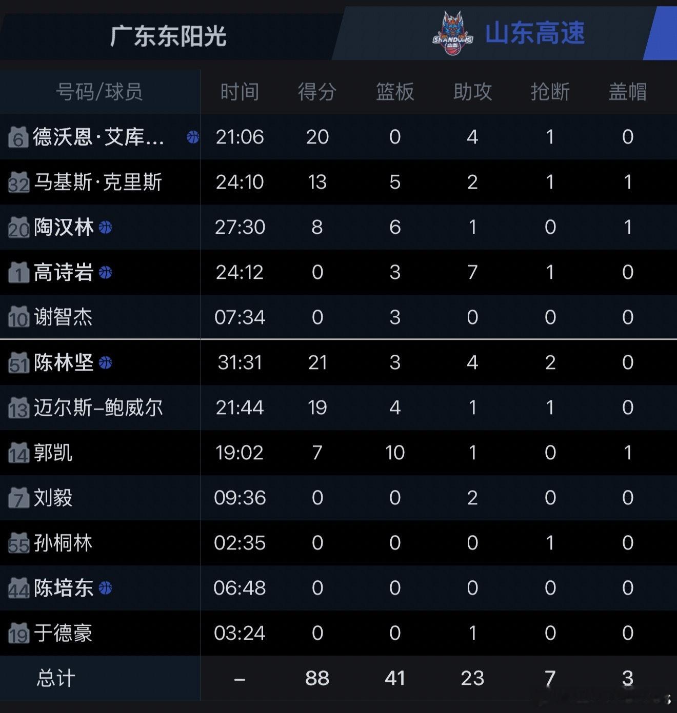 山东高速88:94不敌广东东阳光,遭遇两连败!本场比赛广东队胡明轩、崔永熙、麦考尔、杜润旺依旧因伤无法出战,比赛第一节刚开始山东队能跟广东互有攻守,但到了第一节后半段广东展现出了进攻端的强大,拉开比分,第二节进一度拉大比分,克里斯出现情绪波动,第三节山东依靠鲍威尔、陈林坚连续三分球将比分追平,第四节双方依旧紧咬比分,不过山东没有徐杰的大心脏球员,输掉了比赛!数据方面:陈林坚21分,珀塞尔20分,鲍威尔19分,克里斯13分