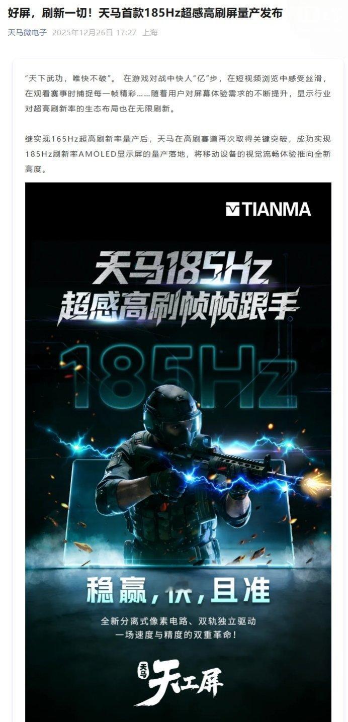 【天马首款 185Hz 超感高刷屏量产发布,具备向 240Hz 延伸的研发能力】天马微电子宣布,继实现 165Hz 超高刷新率量产后,天马在高刷赛道再次取得关键突破,成功实现 185Hz 刷新率 AMOLED 显示屏的量产落地。据介绍,屏幕搭载了天马首创的 AMOLED 分离式像素电路设计,采用数据写入与 DTFT 阈值补偿双轨独立驱动架构,彻底打破了传统像素电路中“速度”与“精度”不可兼得的技术瓶颈。在超高刷新率模式下,屏幕补偿时间大幅提升,首帧亮度比提升 13.4%,图像残留优化幅度达 61%,确保了高速运动画面的清晰利落。天马 185Hz 超感高刷屏,已通过多款旗舰手游的超高帧率测评认证。每帧画面低至 5.4ms 的疾速响应,再结合智能触控算法的超低延时优化,不仅让动态画面无拖影、暗部细节更分明,更在电竞场景中实现“指哪打哪、眼随心动”的跟手体验。屏幕采用电路结构创新,并应用了荣获行业专家评委金奖的新一代低功耗发光器件技术,在实现流畅高刷体验的同时,显著降低整体功耗。同时,屏幕应用了全场景智能频闪调光技术,在流畅之余守护用眼舒适;先进的像素级校准工艺,也保障了屏幕色彩与亮度的出众均一性,画质表现始终稳定出色。天马还透露,目前,公司在高刷新率领域已实现 185Hz 量产,并具备向 240Hz 延伸的研发能力