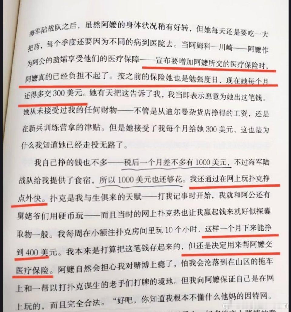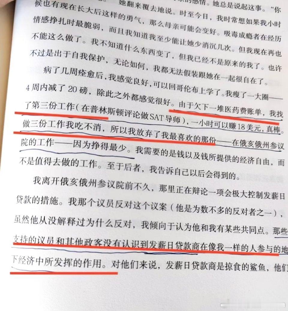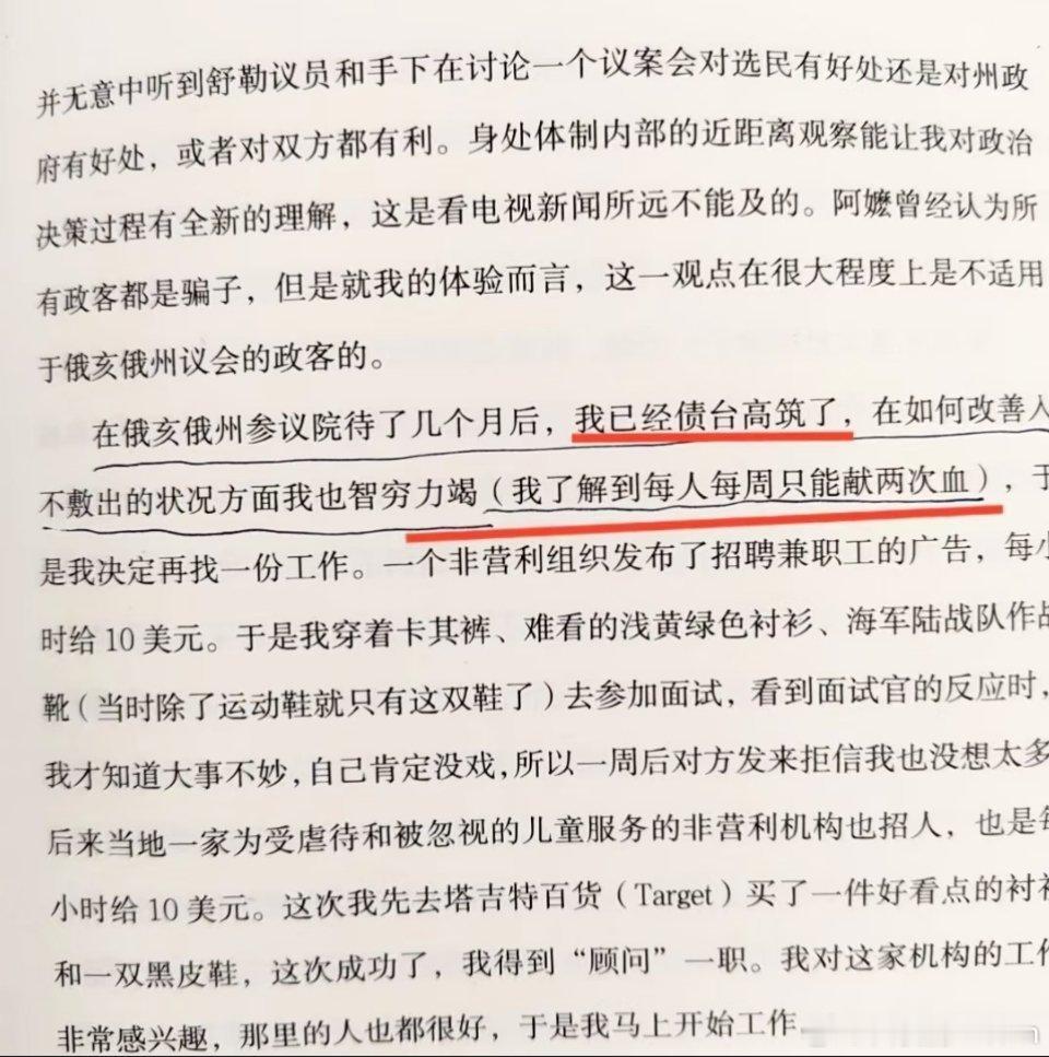 🔻这是美国副总统万斯以前在底层的生活。🔻这本书叫《乡下人的悲歌》🔻里面对美国社会有很多细思极恐的描写,比如万斯债台高筑时,了解到美国规定每人每周只能献血两次,所以他只能再找一份工作,同时打两份工。🔻为什么万斯改善经济状况要去献血呢,因为万斯其实是在卖血赚钱,为什么万斯知道每周两次的献血上限,因为万斯7天献血2次,在第三次卖血时被拒绝了。美国斩杀线海外新鲜事