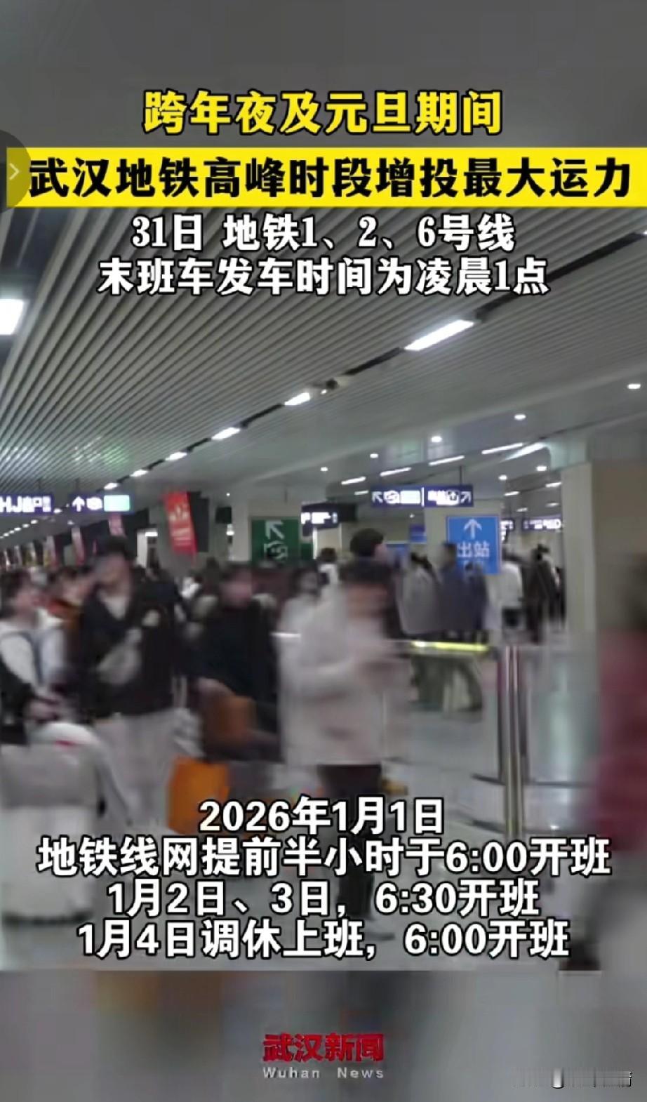 武汉人注意了, 2025年12月31号, 武汉地铁时间将延长, 跨年夜以及旦期期间, 武汉地铁高峰期间将增投最大运力, 地铁1,2,6号线末班车发车时间为凌晨1点,3,4,5,8以及11号线延长运营1小时,末班车时间为0点! 1月1号早班调整为6点, 2号,3号调整为6点半, 4号调整为6点, 这些时间大家可要记好, 可以合理安排出行, 马上就要过元旦, 想必出行的人会很多, 大家一定要注意安全, 可以看出这次武汉地铁非常的用心, 这是做好了元旦假期安排!