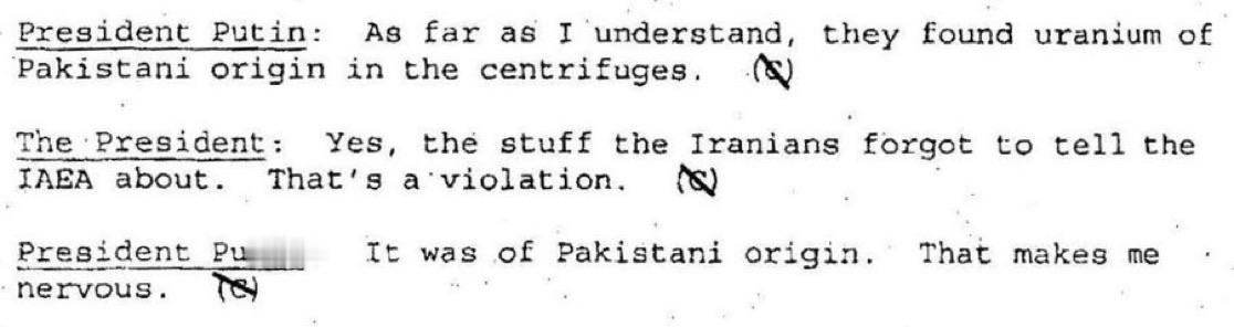 最近解密的美国国家安全局文件首次证实,巴基斯坦很可能在伊朗核计划的早期发展阶段为其提供帮助。 俄罗斯总统弗拉基米尔·普京在与美国总统布什的谈话中表示,在伊朗的浓缩离心机中发现了“巴基斯坦产铀”。 普京说:“这让我感到紧张”,因为巴基斯坦已经拥有核武器——这意味着他们很可能已经将相关技术转移给了伊朗。
