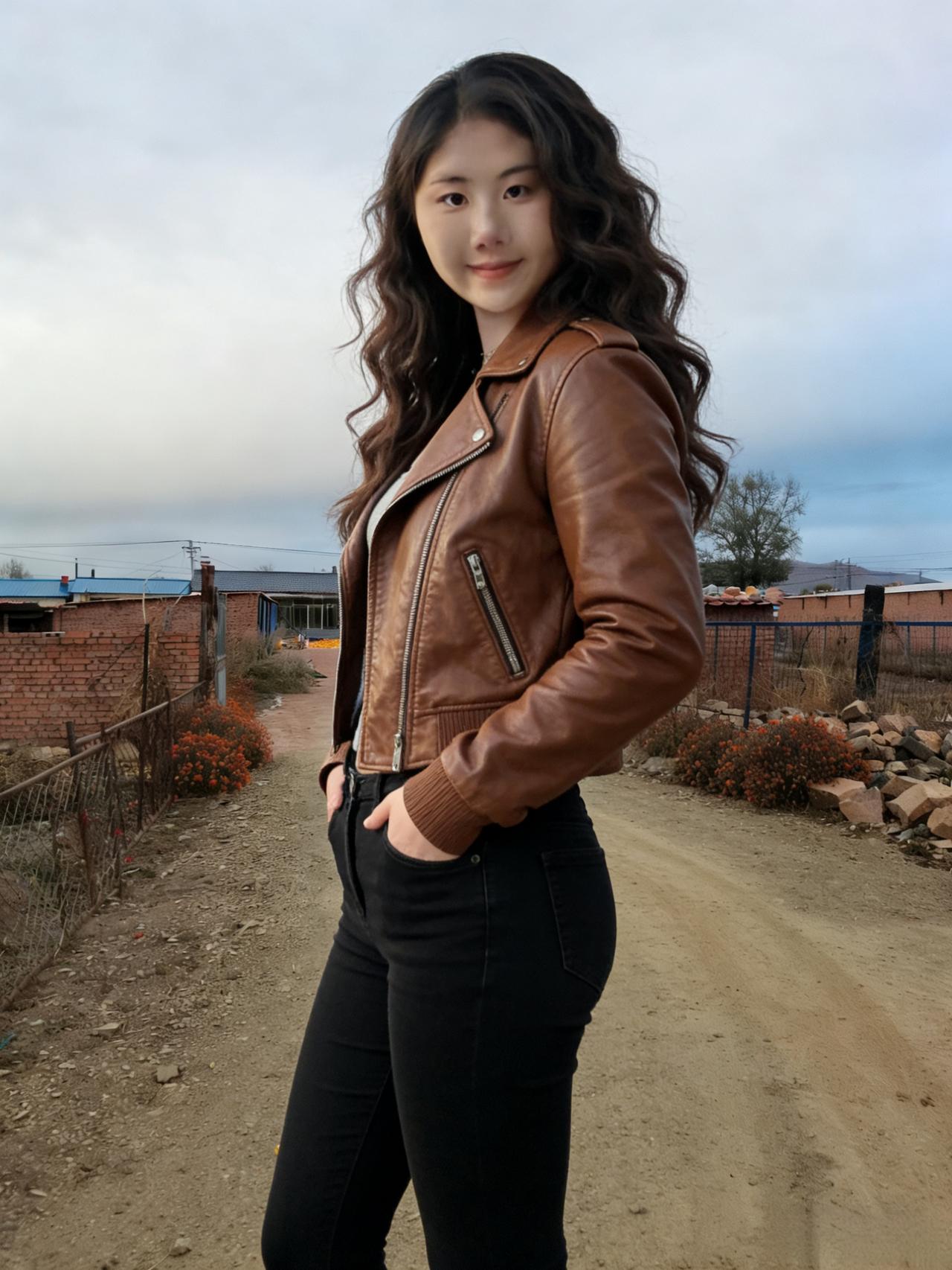 棕皮衣裹着年少的莽撞 卷发缠着未凉的热忱 土路向远方延伸,像未写完的故事 她把手插进口袋,握住了自由的风 ~ 红砖房的斑驳是时光的印记 她的身影,是闯入旧画的新潮 皮夹克的拉链半开 漏出藏在心底的讽爽与勇敢 ~ 风掠过耳畔,说着远方的山海 她站在那里,不说话也像告白 青春的棱角还未被磨平 在乡野,伴着凋零的雏菊肆意盛开