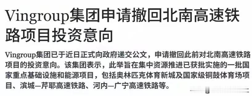 一出闹剧! 刚过一周,越南首富温纳集团宣布撤回参与南北高铁项目的竞标! 此前温纳与德国西门子签约,引进德国高铁的设备与技术,合作两条短程高铁项目,被媒体高度预期将回介入越南的南北高铁项目! 没想到,仅仅刚过一周,温纳集团就公开宣布不会介入南北高铁!其主要原因投入资金与未来收益有很大差距,作为民营企业也不敢冒然切入如此大的项目!关键越南政府不愿提供35年零利率的贷款,所以温纳集团宣布退出! 南北高铁项目确实很诱人,但670亿美金的投资对于缺钱的越南政府来说也是捉襟见肘,何况越南还有很多大事迫在眉睫! 最主要目前河内与胡志明两市之间有普通列车,依照越南国人的消费需求,完全可以用时间换金钱,何必花钱坐高铁!即便赶时间,两地之间的航班也便宜,所以南北高铁未必就是香饽饽! 看起来南北高铁有点烫手,如果中国不参与,越南想办大事有点难!好在中越边境标准轨铁路,中国正在帮助修建中!